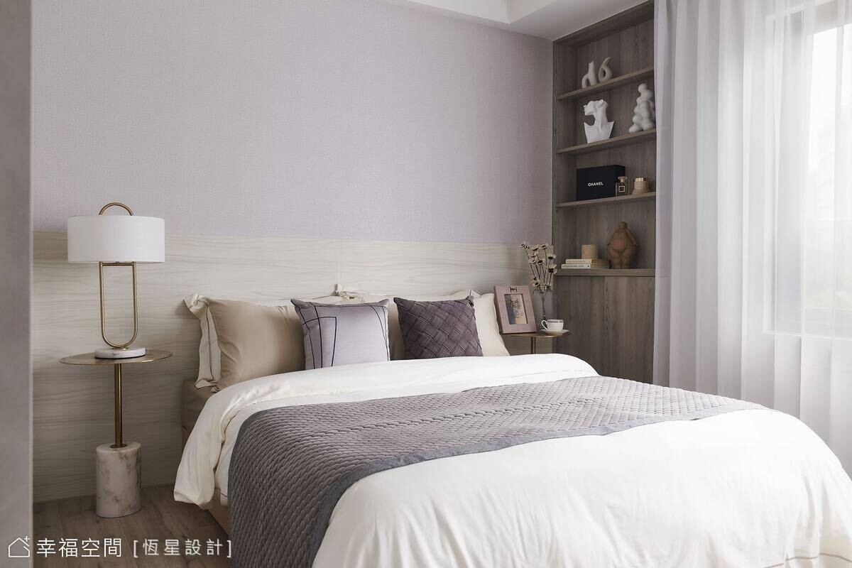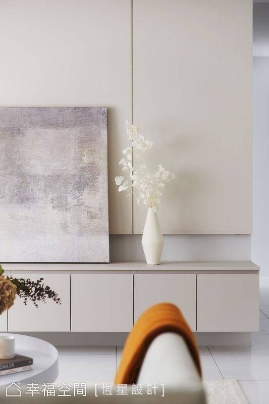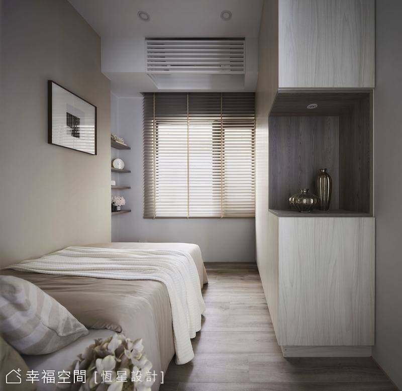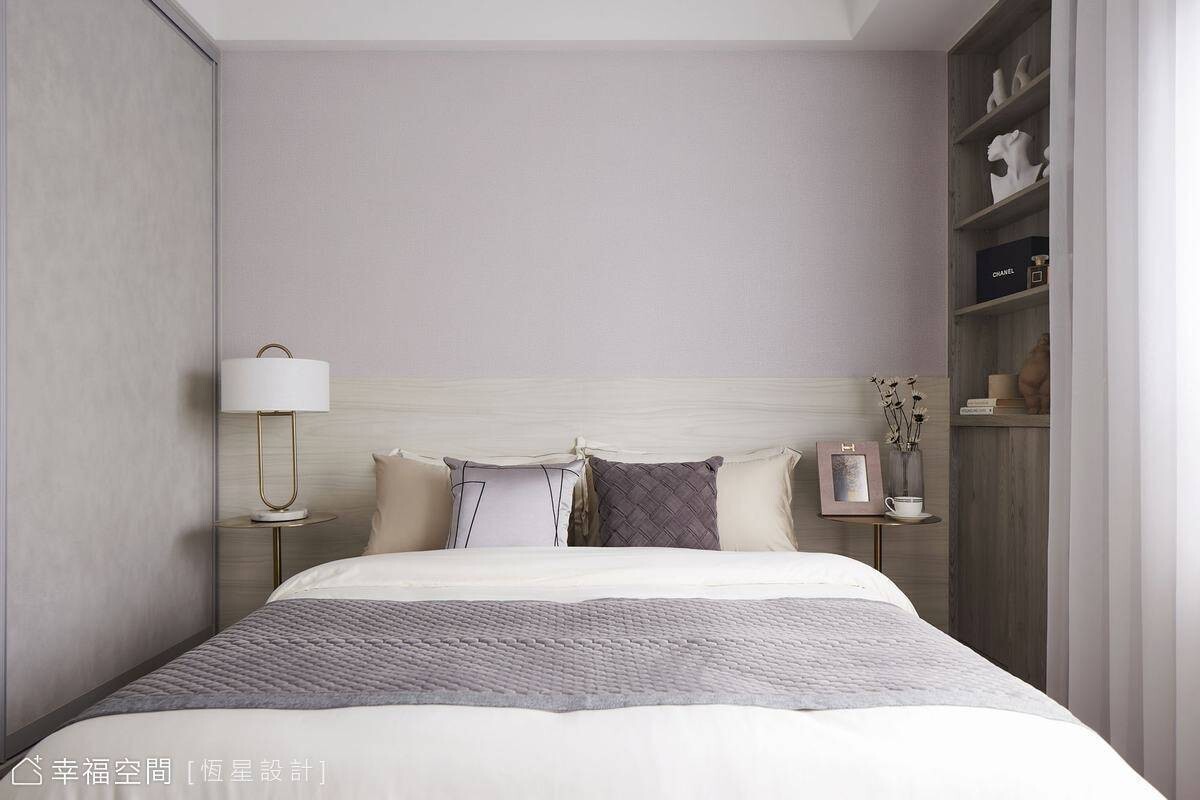 主臥室整體為大面積的米灰色調,將主視覺以跳色軟件(床罩織品等)來做體現,再搭配擺飾增加主臥慵懶放鬆的氣氛。