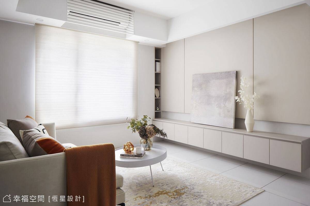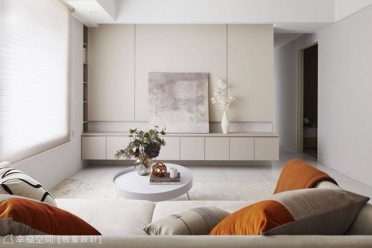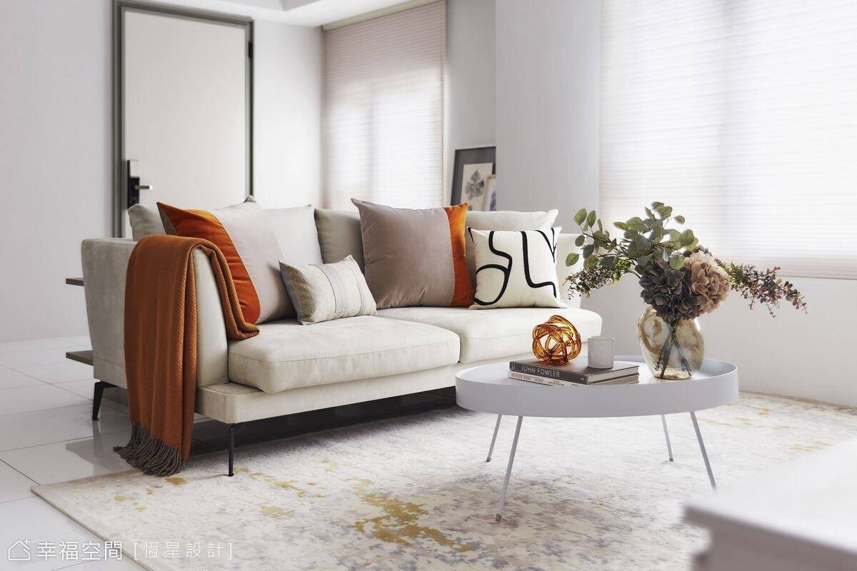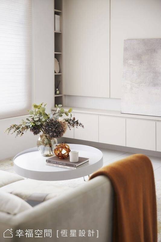 主臥室整體為大面積的米灰色調,將主視覺以跳色軟件(床罩織品等)來做體現,再搭配擺飾增加主臥慵懶放鬆的氣氛。