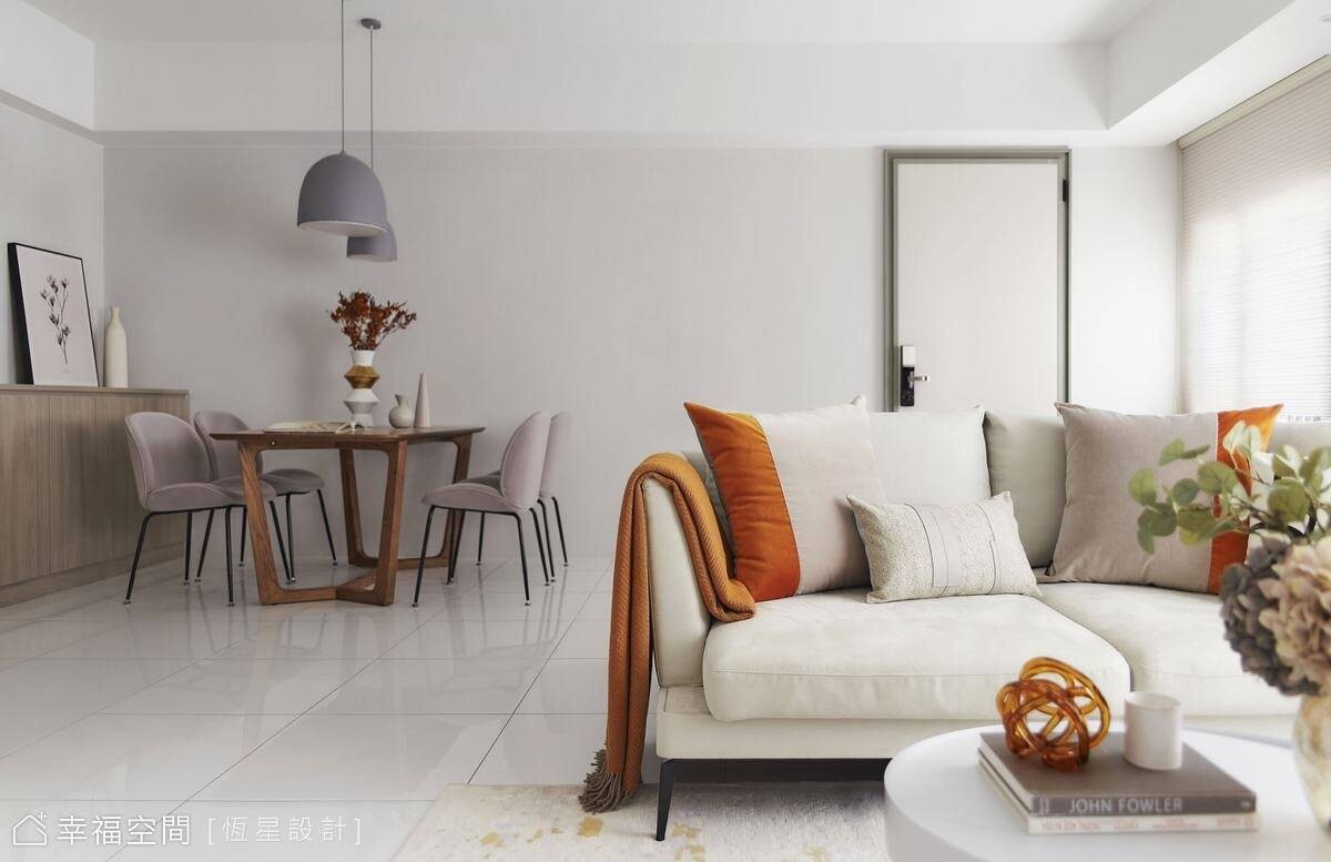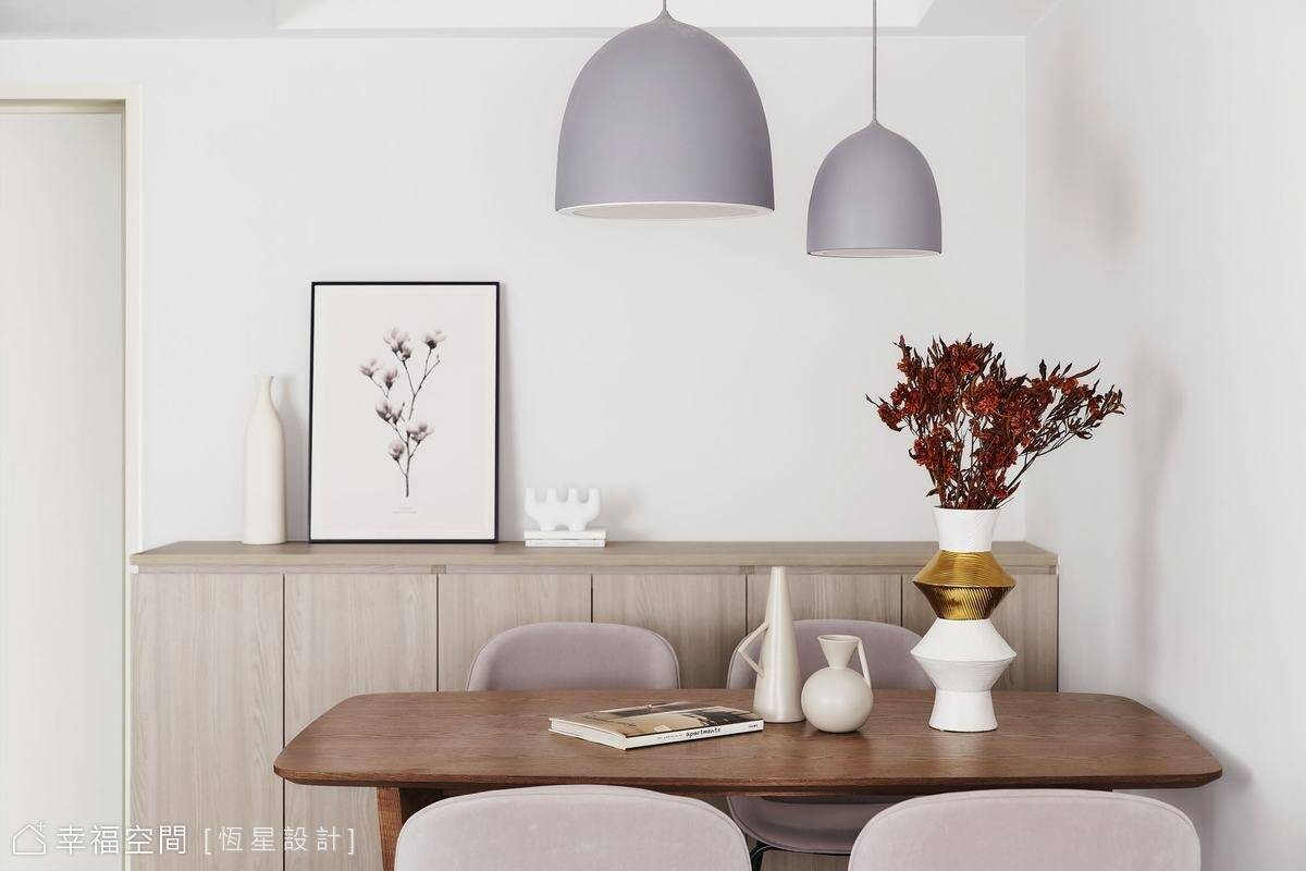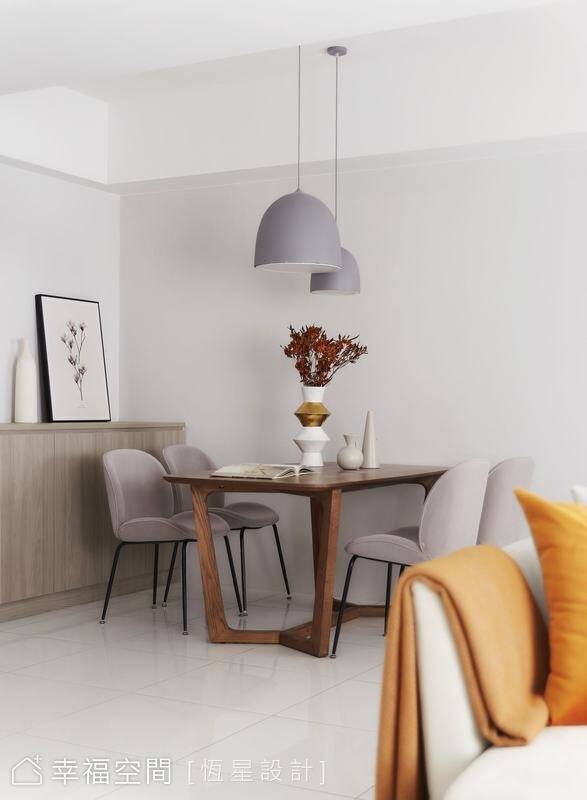 選用圓弧線條的餐桌椅,搭配現代風格的吊燈,讓空間更圓融有趣。
