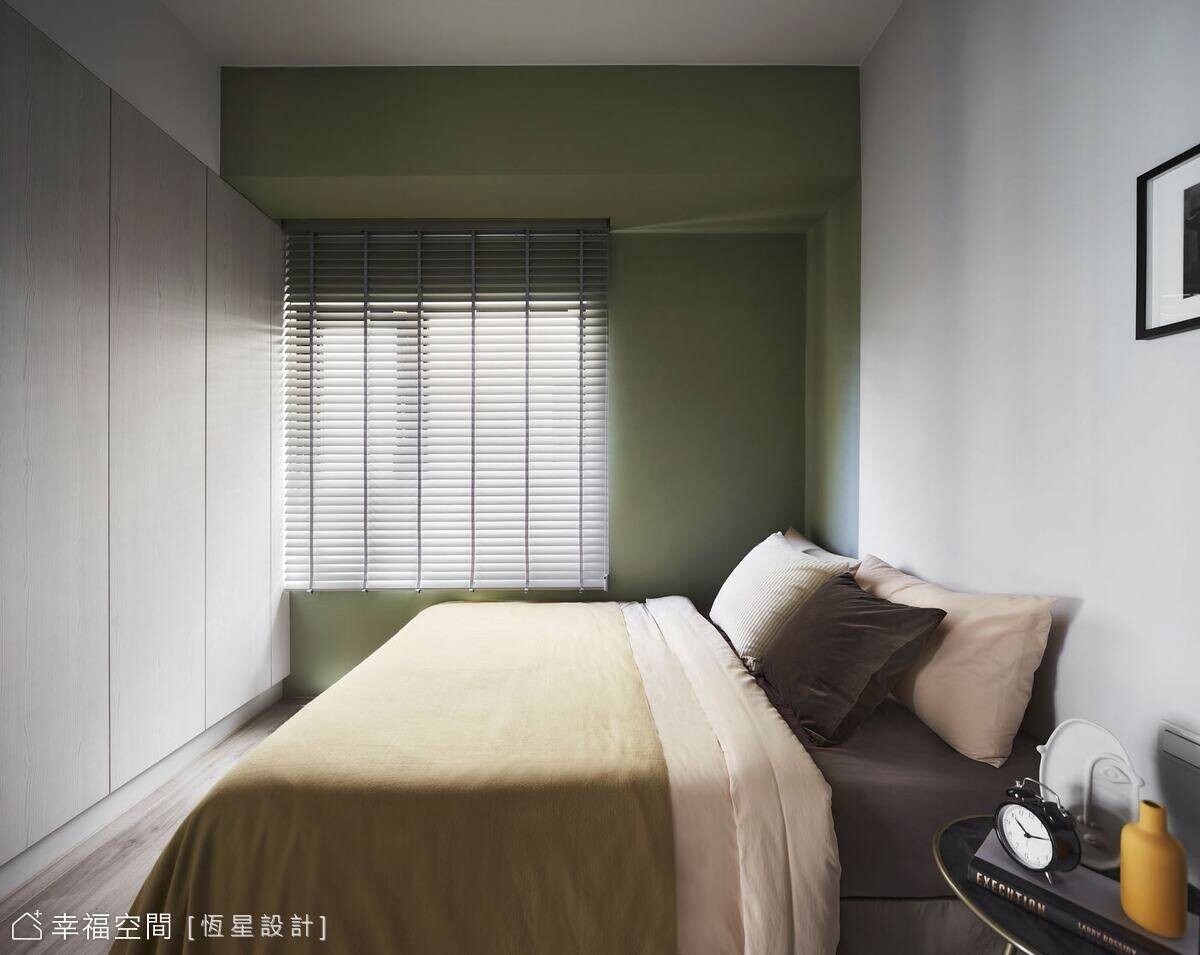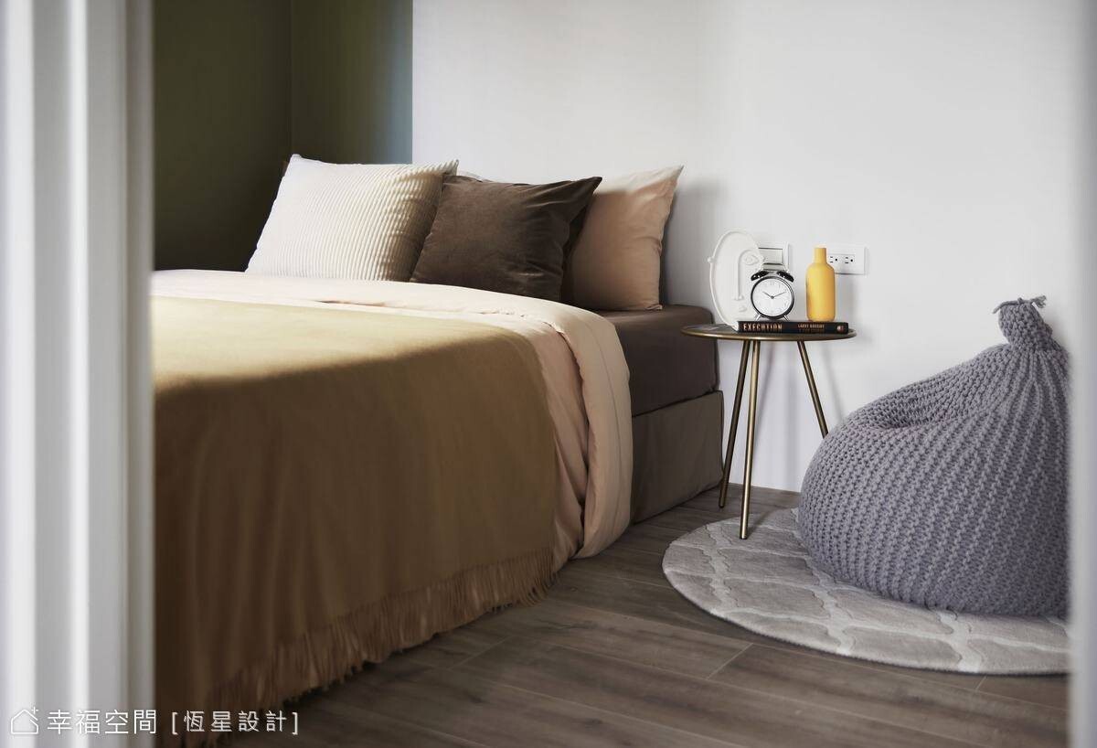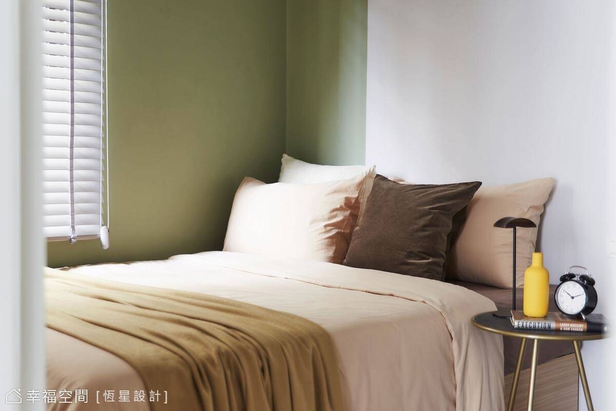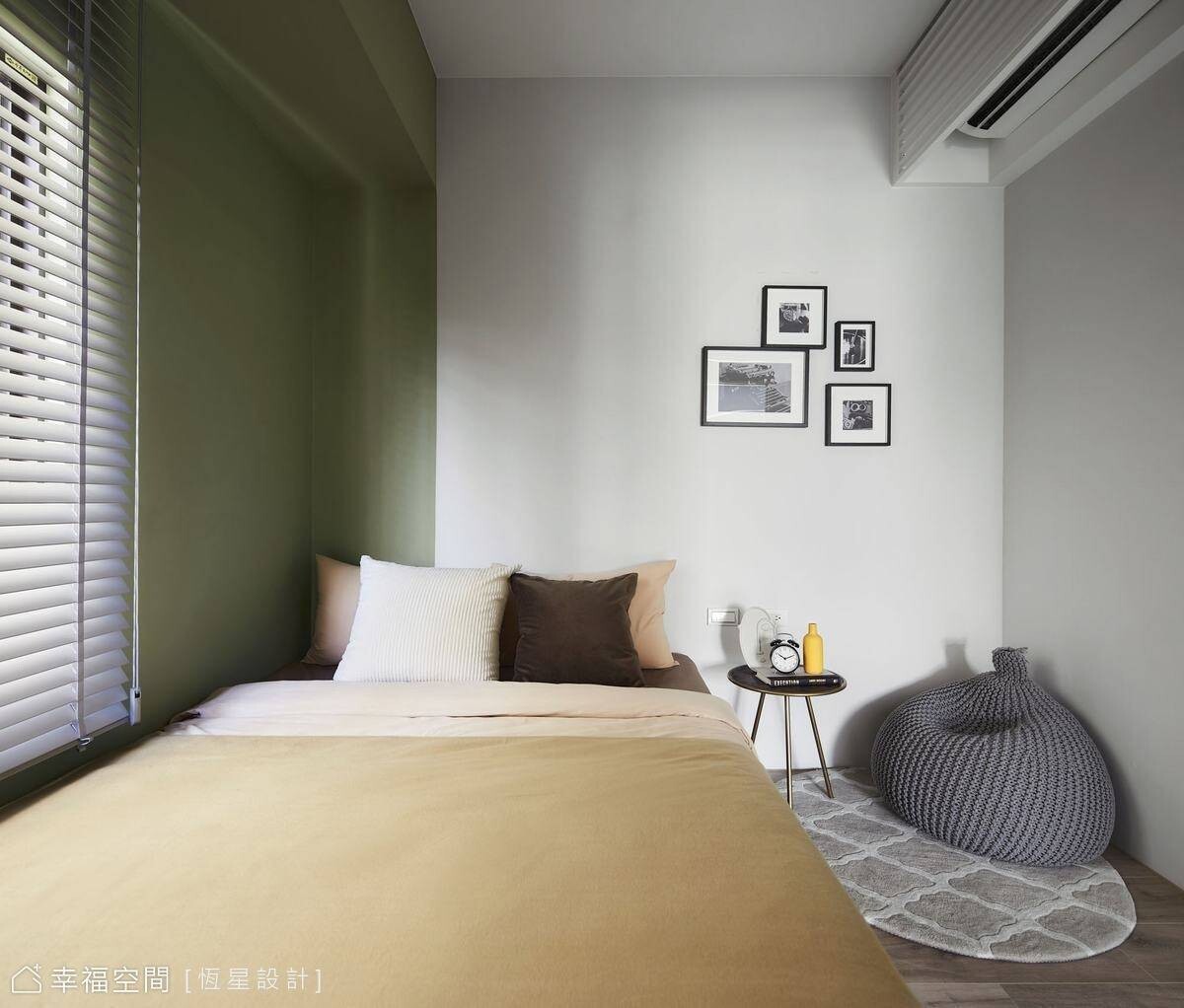 次臥床頭配內斂的灰綠色作為跳色牆,活潑卻不過份搶戲;灰色的基底色彩,可讓色彩更能相互融合。