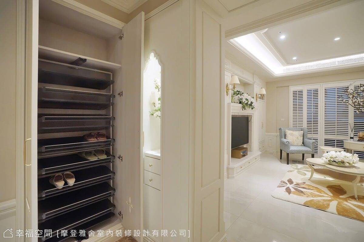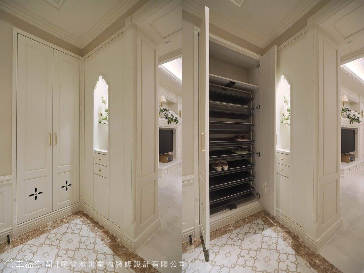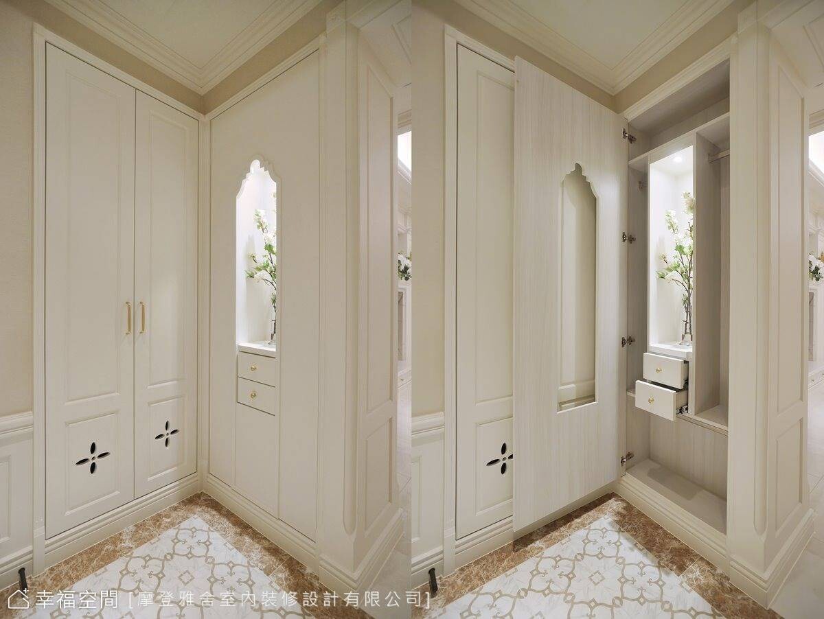 主臥室撤除原本區隔化妝區與睡眠區的大衣櫃,拾回敞亮無壓空間感,並裹上嬌嫩粉色、搭配純白線板烘托春意盎然情韻。化妝台被挪至床邊,側面裝設層板作為化妝品的歸屬,一旁臥榻、床尾衣櫃亦藏匿著龐大儲藏空間,以供居者收納。主衛以繽紛花磚鋪陳,滿足女主人喜好,浴室設置於客衛中,地坪採止滑地磚,洗臉台壁面拼貼馬賽克磚,點綴鏤空鏡面與壁燈,釀構華美情境。摩登雅舍室內裝修設計除了追求造型、美感,機能上也不將就,盡力發揮最大坪效,同時顧及基本風水格局,讓屋主住得舒心、安心。