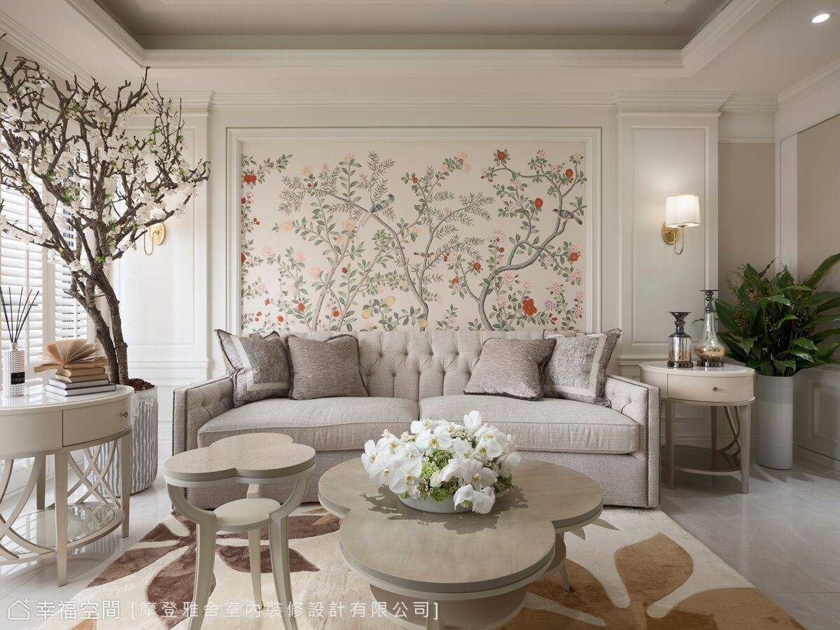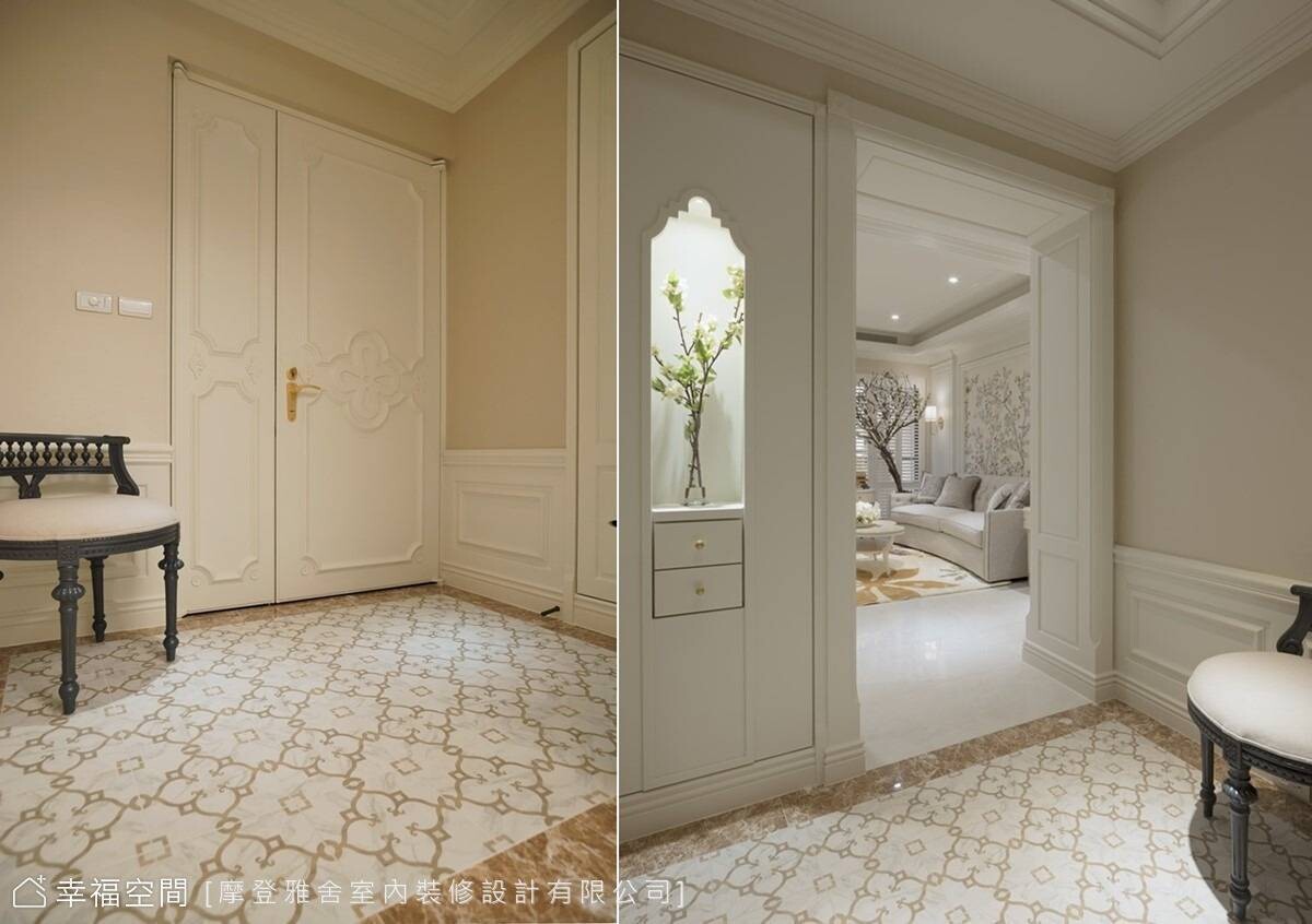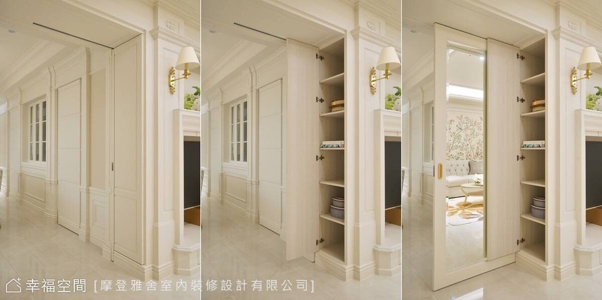 由於房子存在天花板過低、色彩偏暗、穿堂煞風水等問題,故設計師首先以端景櫃圍塑出獨立玄關化解風水問題,並提升藏物量。公領域選用男主人喜愛的素雅柔和色調渲染,營塑家的溫馨感,但仍藉由一幅具東方美感的鮮豔壁布砌築層次感。客廳和餐廳銜接的門拱位置,植入一道拉門,並貼上鏡子,以便女主人漫舞。