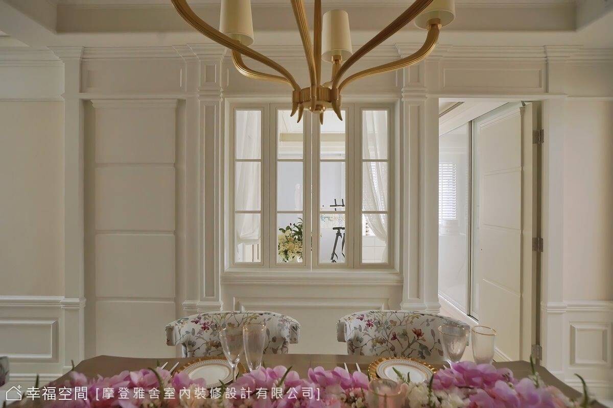 餐廳配有備餐櫃、展示櫃陳列精緻餐具、儲藏生活物品,再利用淺色、玻璃門片與燈帶,消弭大面櫃體帶來的厚重感。最特別之處是,餐廳與走道的隔牆,貼心落下一道格子窗引入光源、擴展視野外,也讓埋頭於設計的女兒,多了與家人交流的窗口。多功能室內的櫃體門片細心選用磁性烤漆玻璃,賦予塗鴉、黏貼MEMO功能,內部亦配置了多層玻璃立面抽屜,以便使用者收整各式各樣的工具、材料。女兒房與多功能室互通,讓經常熬夜工作的女兒累了能就近休息,補足體力。房內以藍白色調營造清新舒眠氛圍,並以百葉窗與線板輕訴浪漫情懷。
