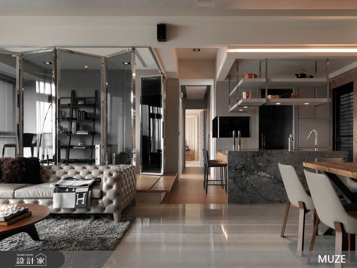 60坪現代風空間裡,單面採光引入自然日光,照亮異材質刻劃、激盪的美學靈感;依循開放公領域的思維,透過玻璃折門界定書房兼多功能室,通透的材質特性,讓光能無礙的流淌一室,形塑流動、互動性的居家場域。