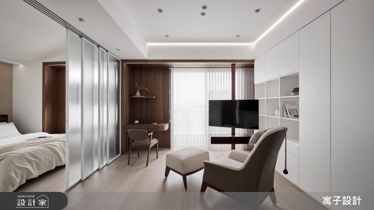 臥室用長虹玻璃拉門取代隔間,在隱私性與空間感之間找到最佳平衡;將書桌移置拉門外側,在大面窗邊打造結合茶几功能的臥榻設計,營造除了床鋪以外的休憩空間。活動是隔間能讓屋主在床上休息時也能舒適觀影,將工作區設定在客廳界定了工作與休息場域,同時也更符合單人生活的步調。床頭背牆用進口塗料營造質樸溫潤的紋理,在簡約設計下增添了許多耐人尋味的細節。