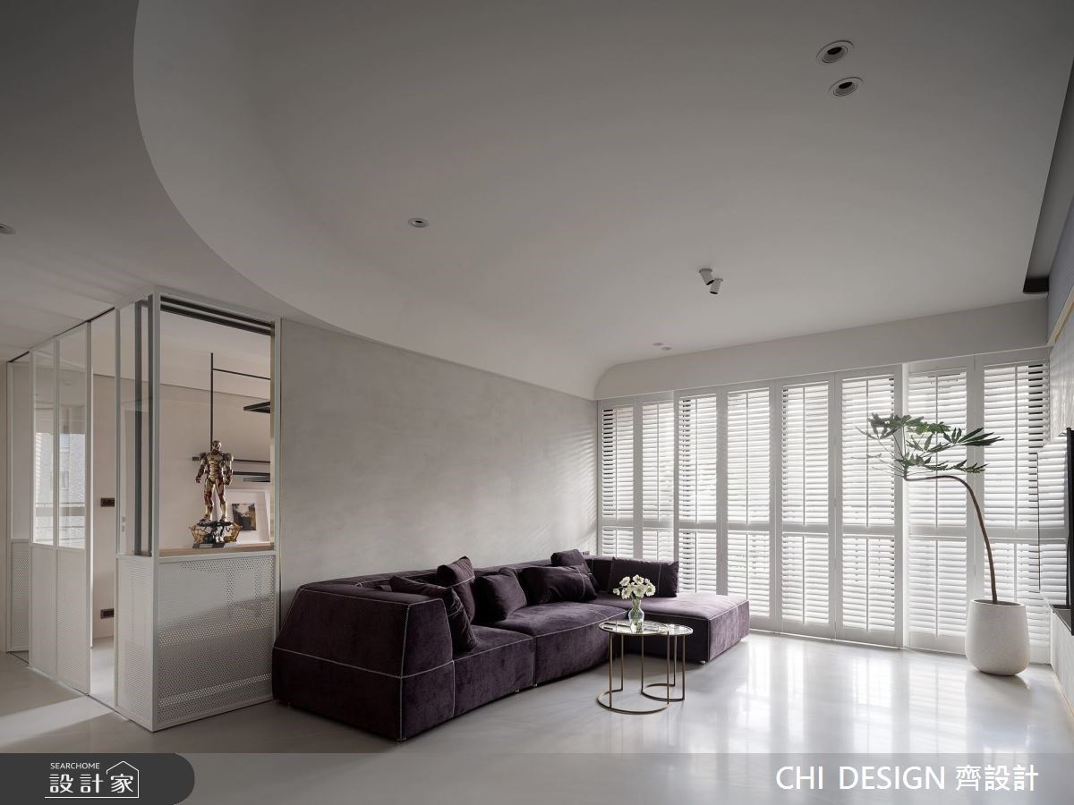 清透隔間優化格局創造更寬敞的生活動線,電視牆仿製櫃體造型延展尺度,樂土和鍍鈦飾板豐富視覺。盤多磨無接縫地板更具放大空間的效果,搭配天花板的弧線造型,在視覺與體感上都做了提升。臥室衣櫃運用美式線板並結合隱藏門設計,並在更衣區的窗戶下增設矮櫃,放上盆栽或香氛形塑舒適端景,而住宅內現代風餐燈與床頭藝術壁燈則是空間最自然的點綴。