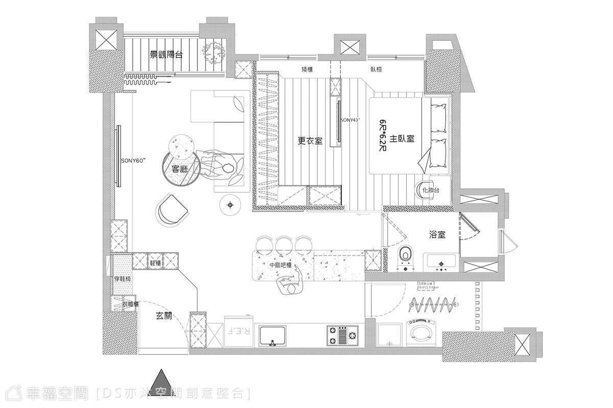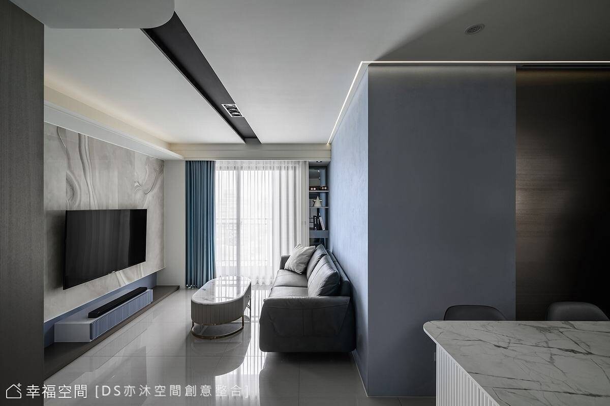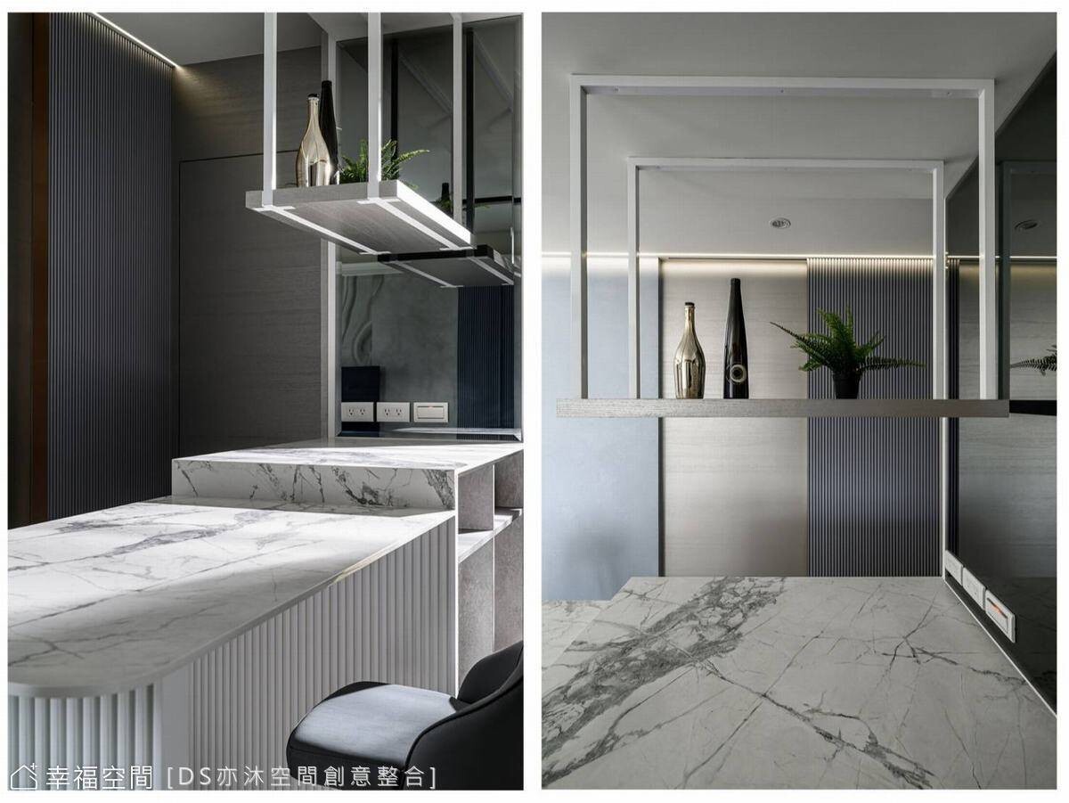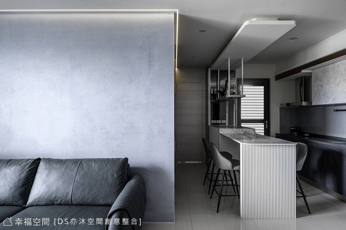 本案空間需求單純,屋主是一位時尚的單身女性,平時以自住為主,假日時偶爾兼具閨蜜們聚會的小天地。鑑於原始平面原為兩小房的設定,於客變時便將兩房打通整合為一,並重新定義客廳的縱深,降低觀賞電視時的視距壓迫;餐廚區已大中島餐檯來重塑用餐空間,階梯式的檯面延續到造型天花,圍塑出空間的另一視覺焦點,若當閨蜜聚會時,亦可搖身一變為吧檯區。