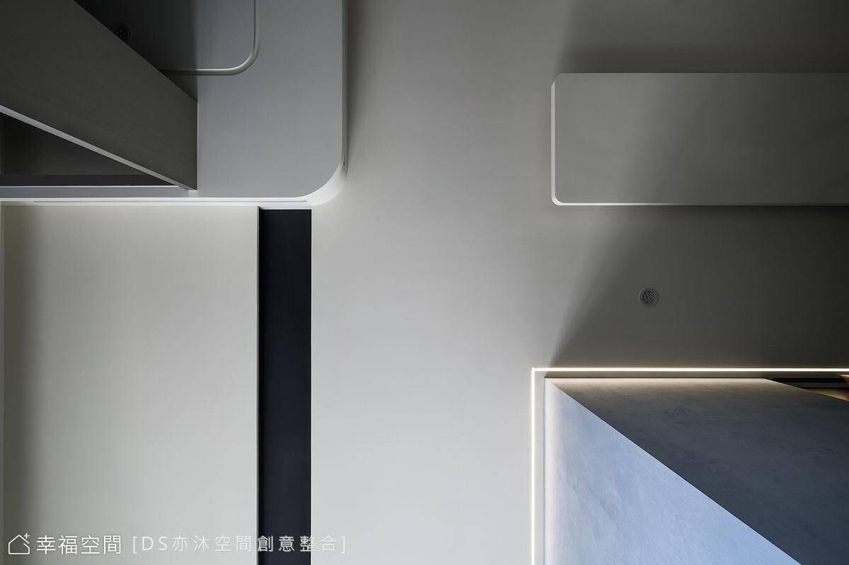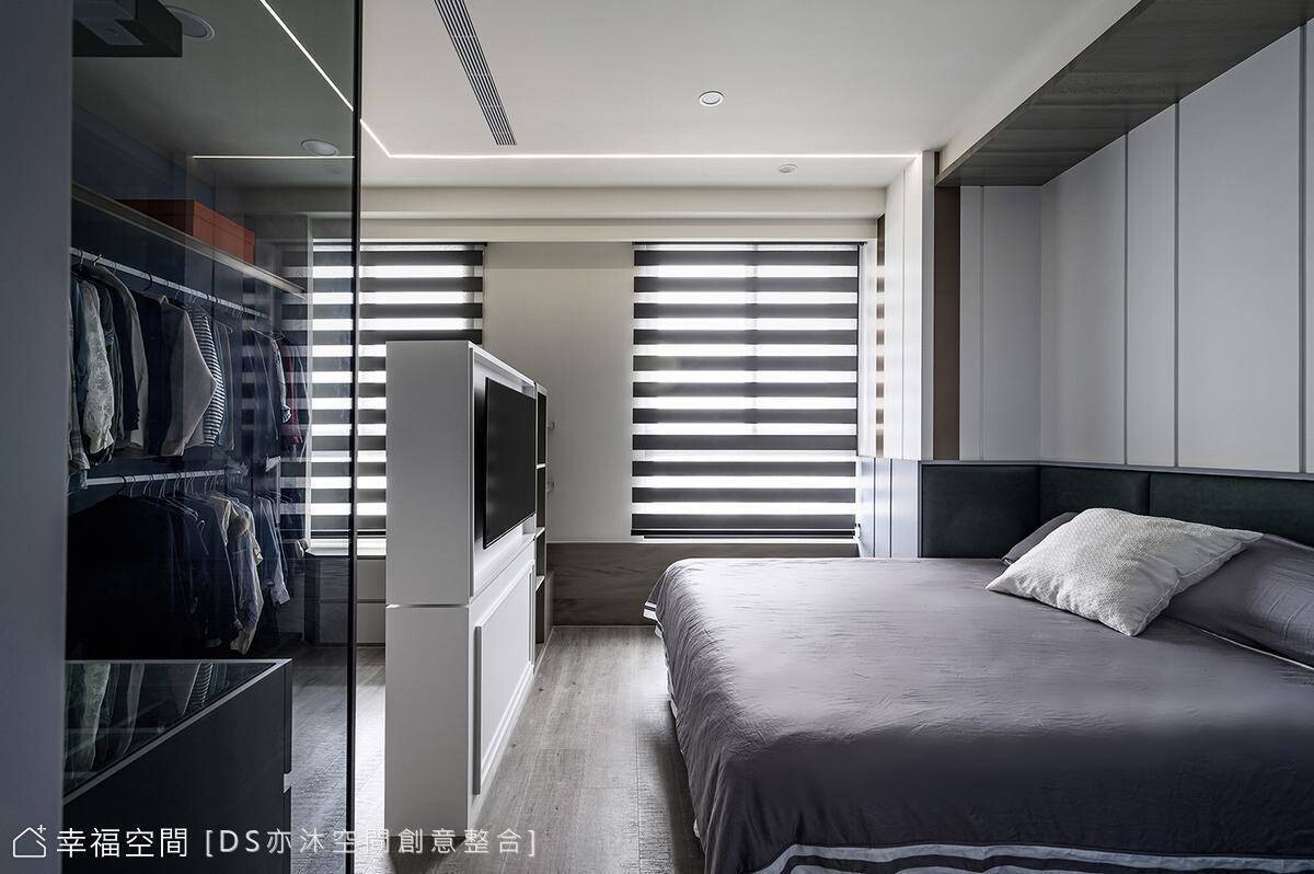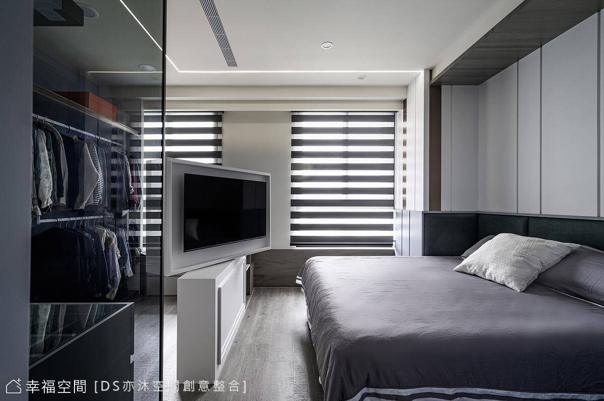 全案設計以"光"貫串全場,不論是藝術塗料映襯出的漫光效果、格柵板勾引出的光影層次或是鍍鈦板的局部點綴,最終依著線性光源的動線引導,將視覺帶入主臥室當中。打通後的主臥室包含一間完整的衣帽間,空間區劃以一座旋轉的半高電視牆面將其區分,充分的保留視覺的開闊感,並延續線性光源與鍍鈦板的語彙,將光影漫流其中。