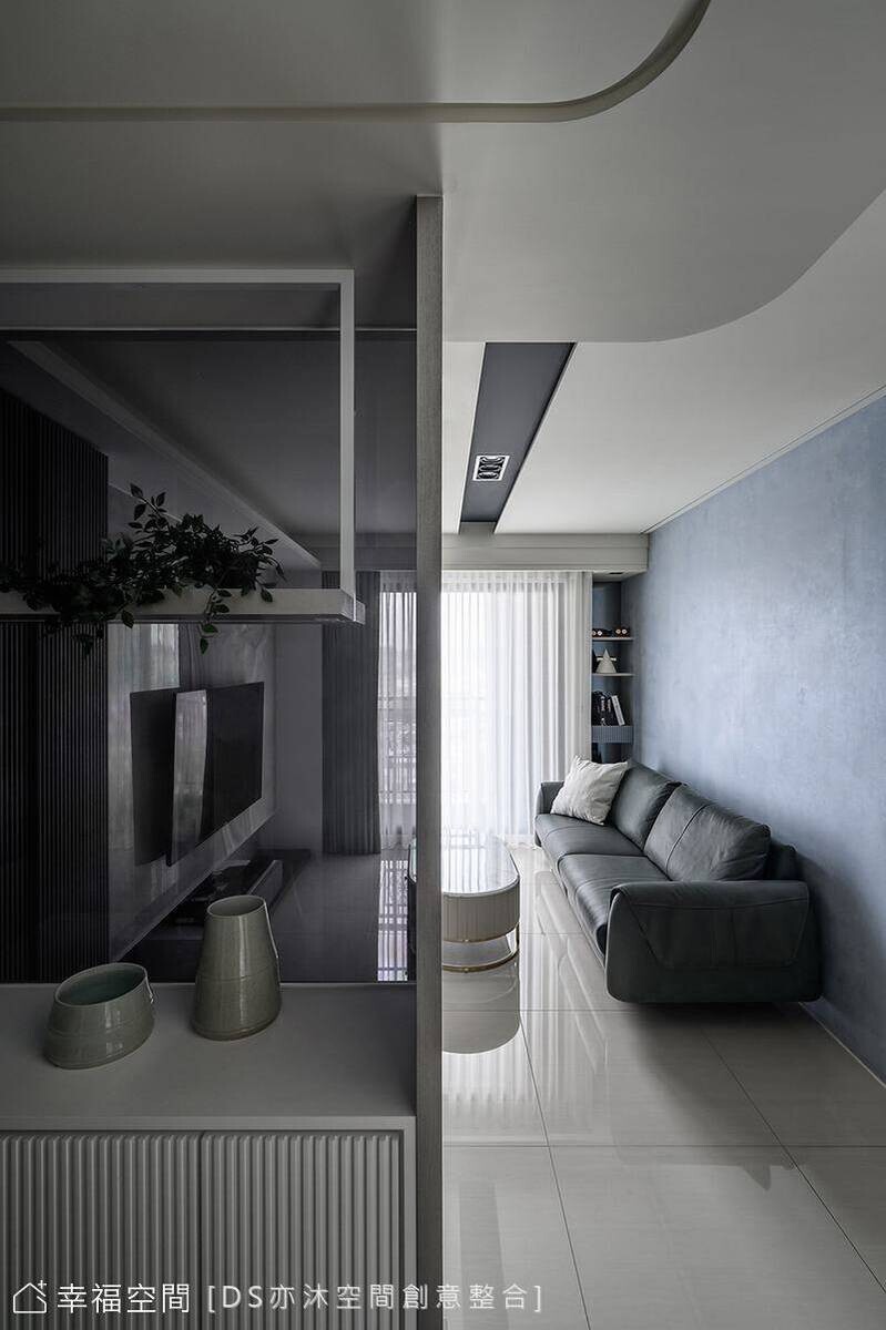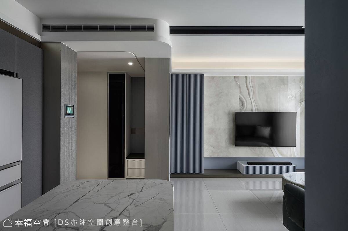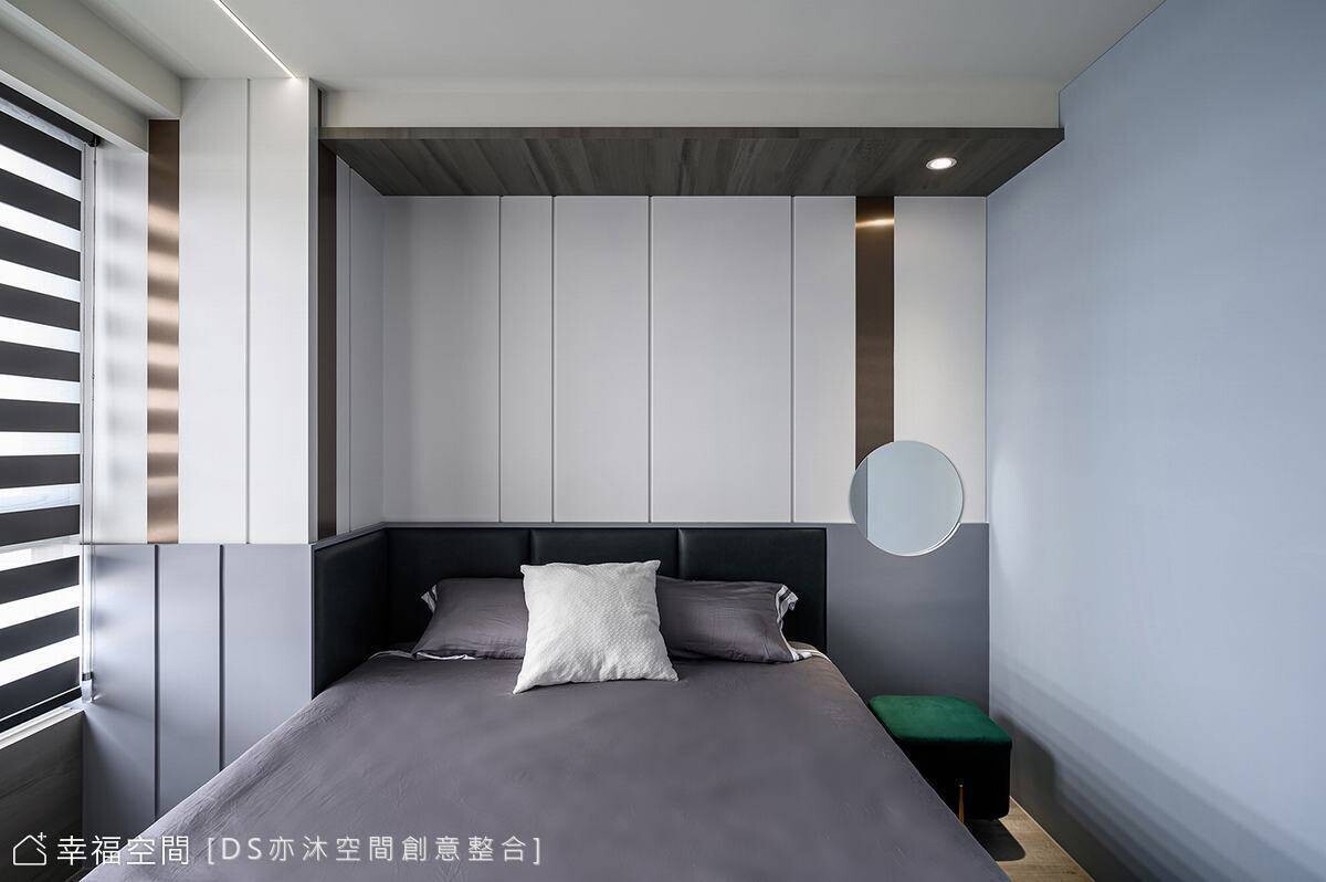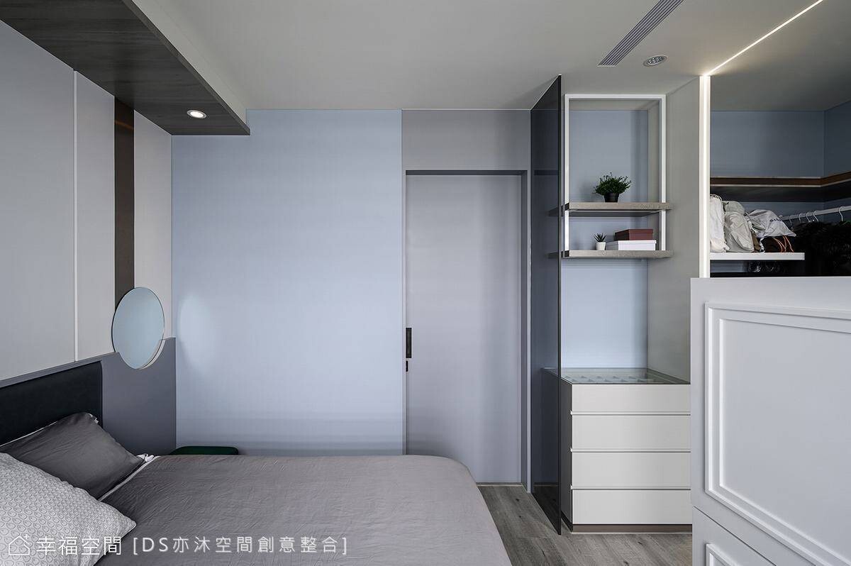 全案設計以"光"貫串全場,不論是藝術塗料映襯出的漫光效果、格柵板勾引出的光影層次或是鍍鈦板的局部點綴,最終依著線性光源的動線引導,將視覺帶入主臥室當中。打通後的主臥室包含一間完整的衣帽間,空間區劃以一座旋轉的半高電視牆面將其區分,充分的保留視覺的開闊感,並延續線性光源與鍍鈦板的語彙,將光影漫流其中。