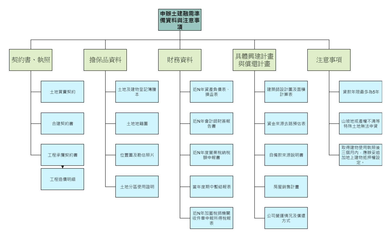 申請土建融往往需要準備三大類資料,分別是「企業基本資料」、「財務資料」與「興建資料」。其中,企業基本資料通常又包括「公司設立變更登記表」、「董監事名冊與股東名冊」、「公司借款股東會議紀錄」、「股東債權居次同意書」、「土地融資承諾書」…等,另外還需要公司執照、負責人財力證明、企業戶金融機構往來情形證明等資訊,提供給銀行作徵信。