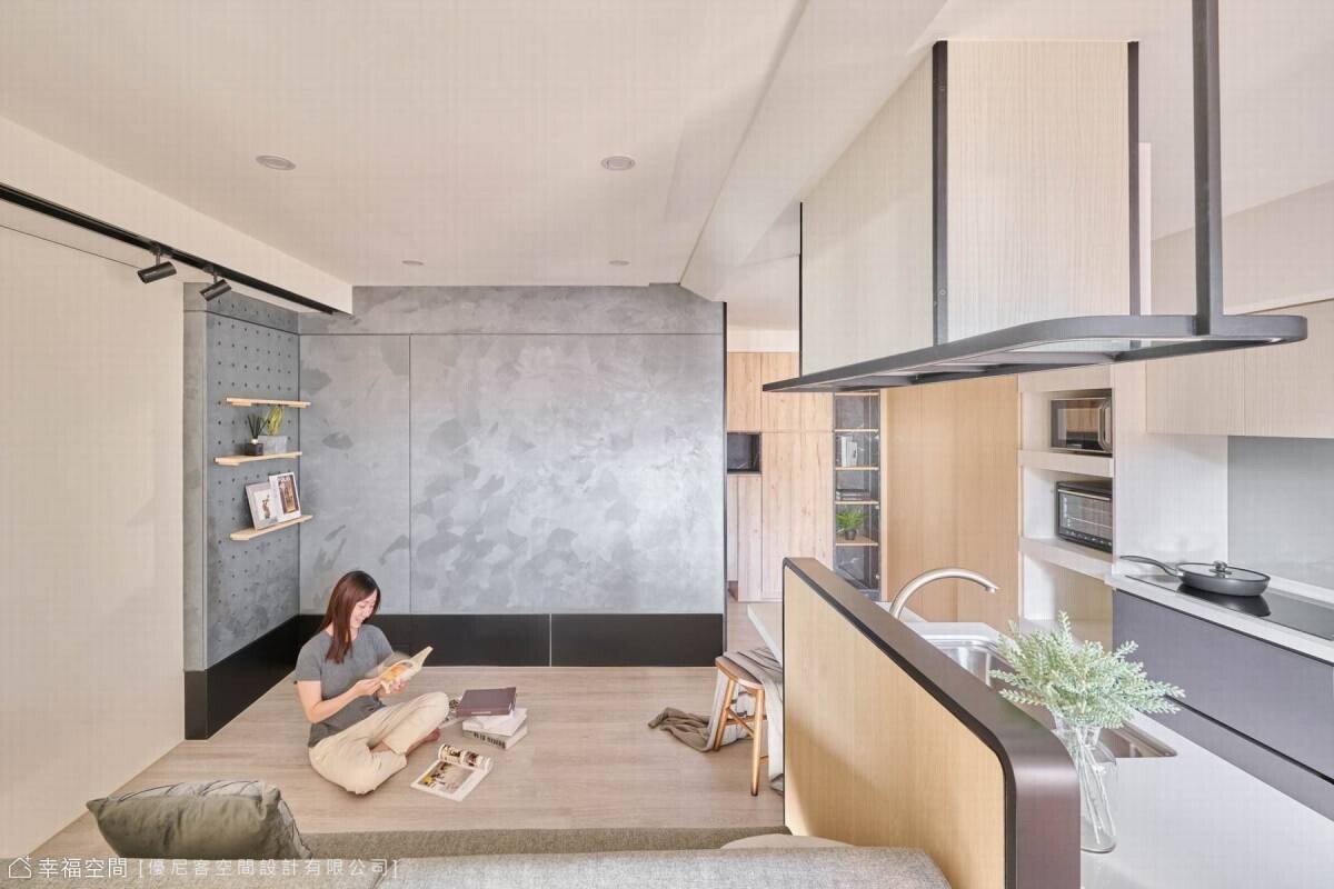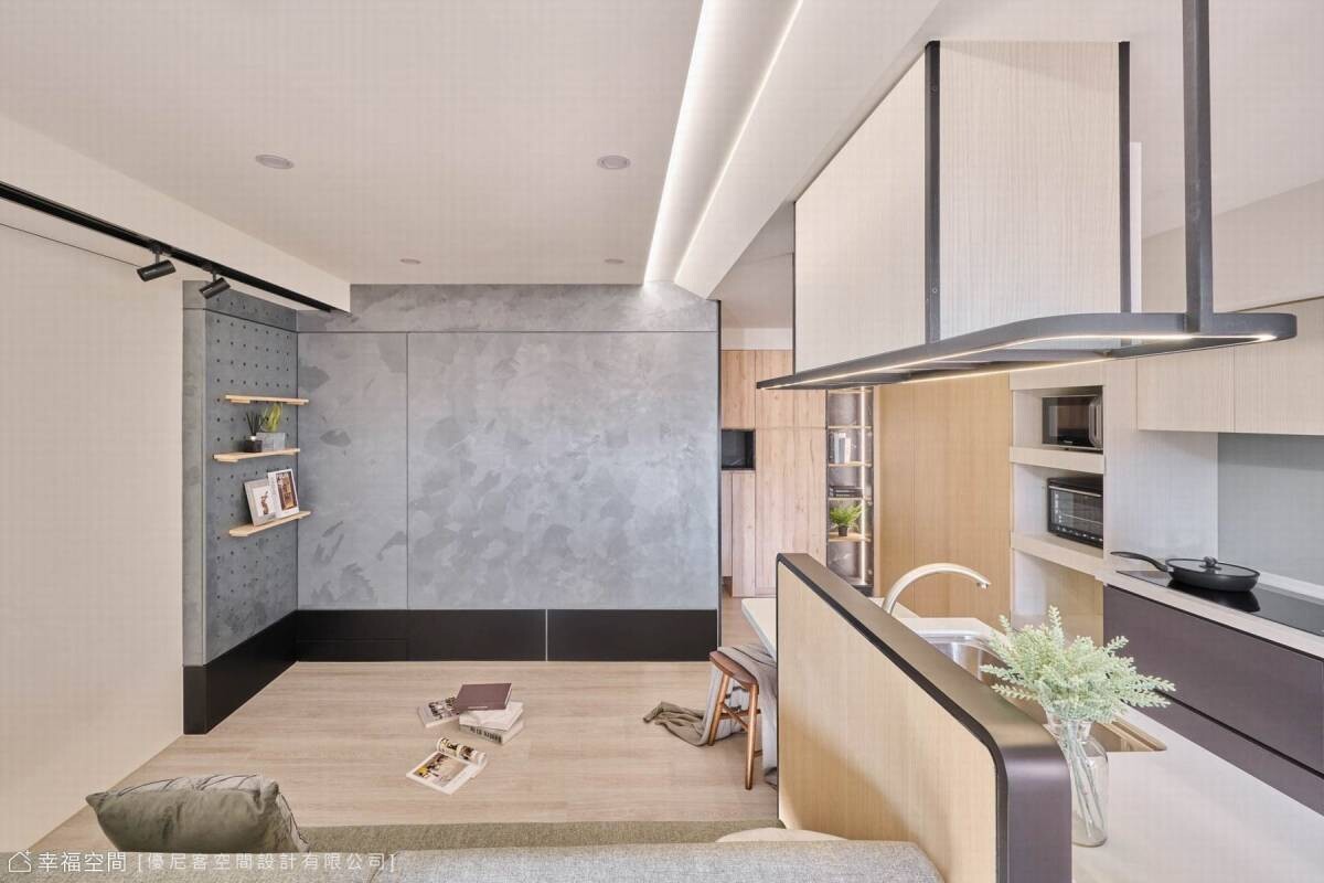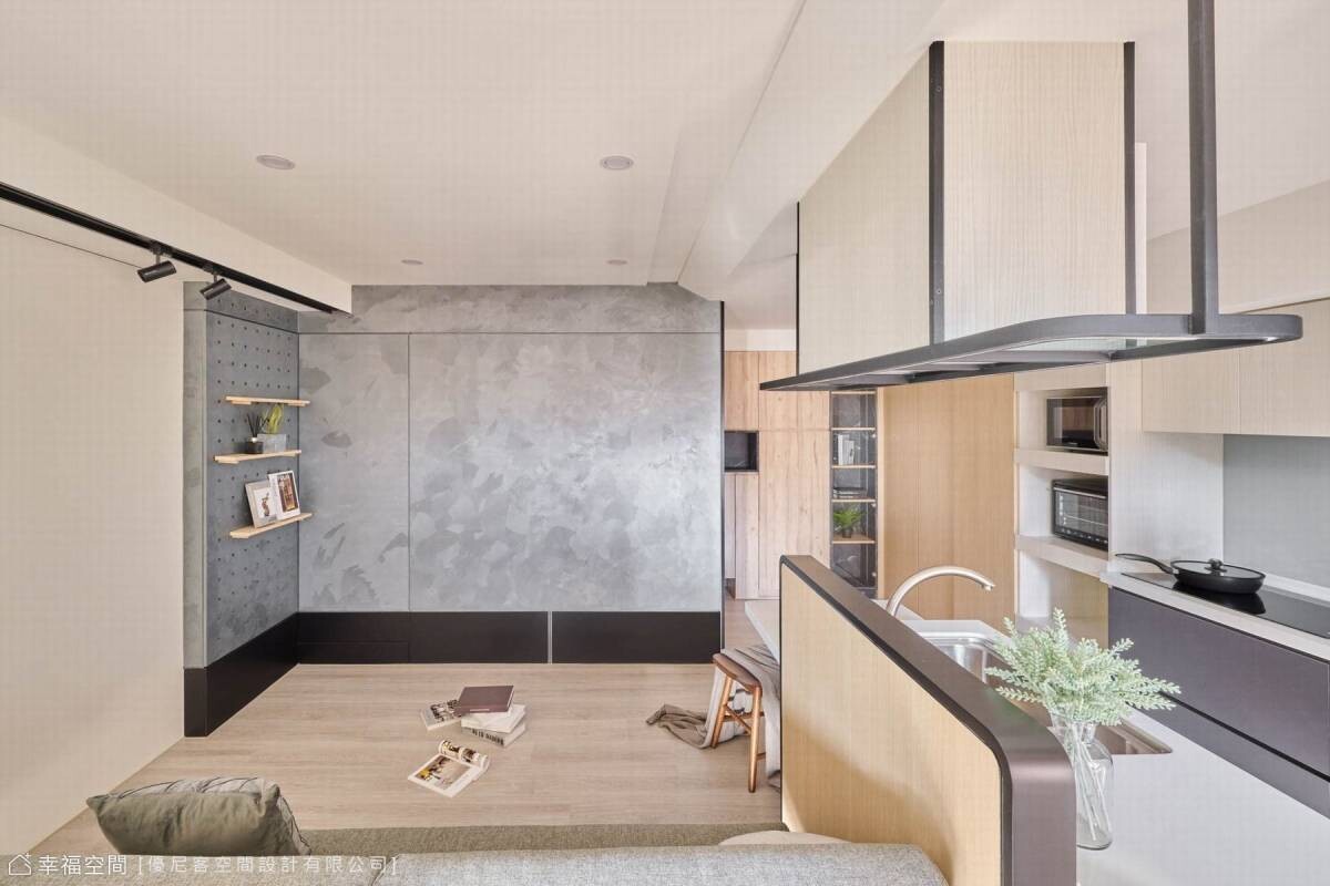 藝術手工塗料在牆上揮灑著,不規則的紋理蔓延出千萬種變化,順勢將廁所入口隱藏;小巧的廚房開啟每日的早晨,而對面的沙發依靠著書桌的沉穩。天花板打破空間既有的限制,在有限的高度中微微傾斜,投射的光線輕輕的界定了空間場域,而鐵件吊架則是結合了烘碗機的功能性與餐桌吊燈的美觀,即使在小空間與開放式的公領域,依然在井然有序的節奏中,享受著慢生活的情趣。
