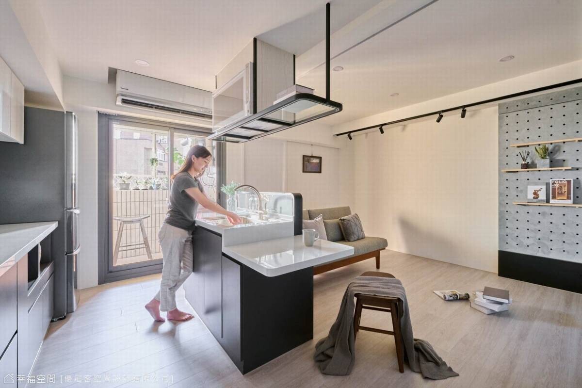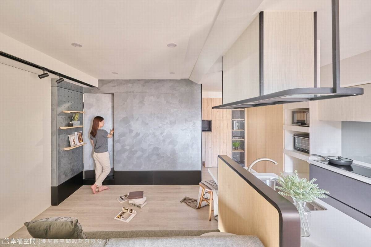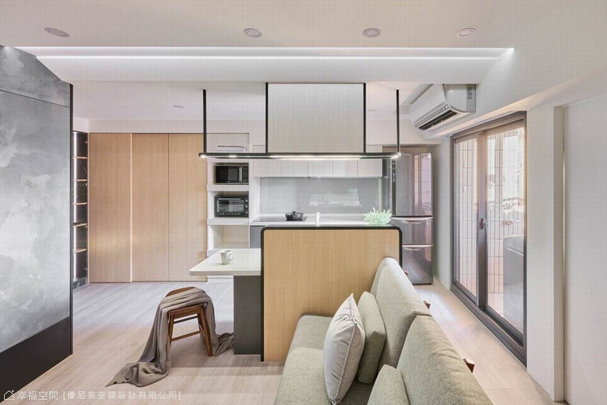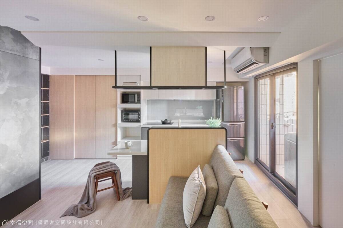 藝術手工塗料在牆上揮灑著,不規則的紋理蔓延出千萬種變化,順勢將廁所入口隱藏;小巧的廚房開啟每日的早晨,而對面的沙發依靠著書桌的沉穩。天花板打破空間既有的限制,在有限的高度中微微傾斜,投射的光線輕輕的界定了空間場域,而鐵件吊架則是結合了烘碗機的功能性與餐桌吊燈的美觀,即使在小空間與開放式的公領域,依然在井然有序的節奏中,享受著慢生活的情趣。