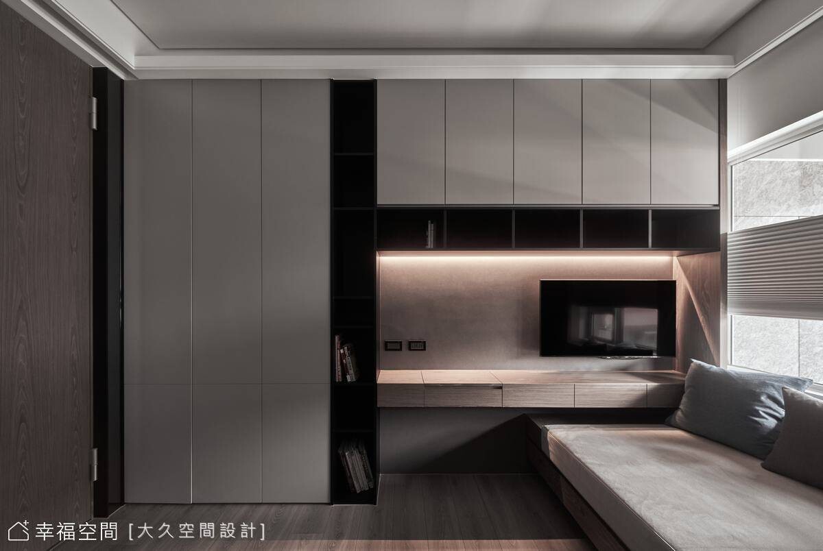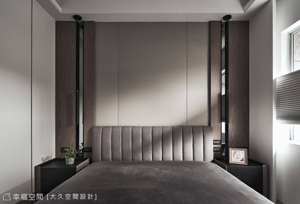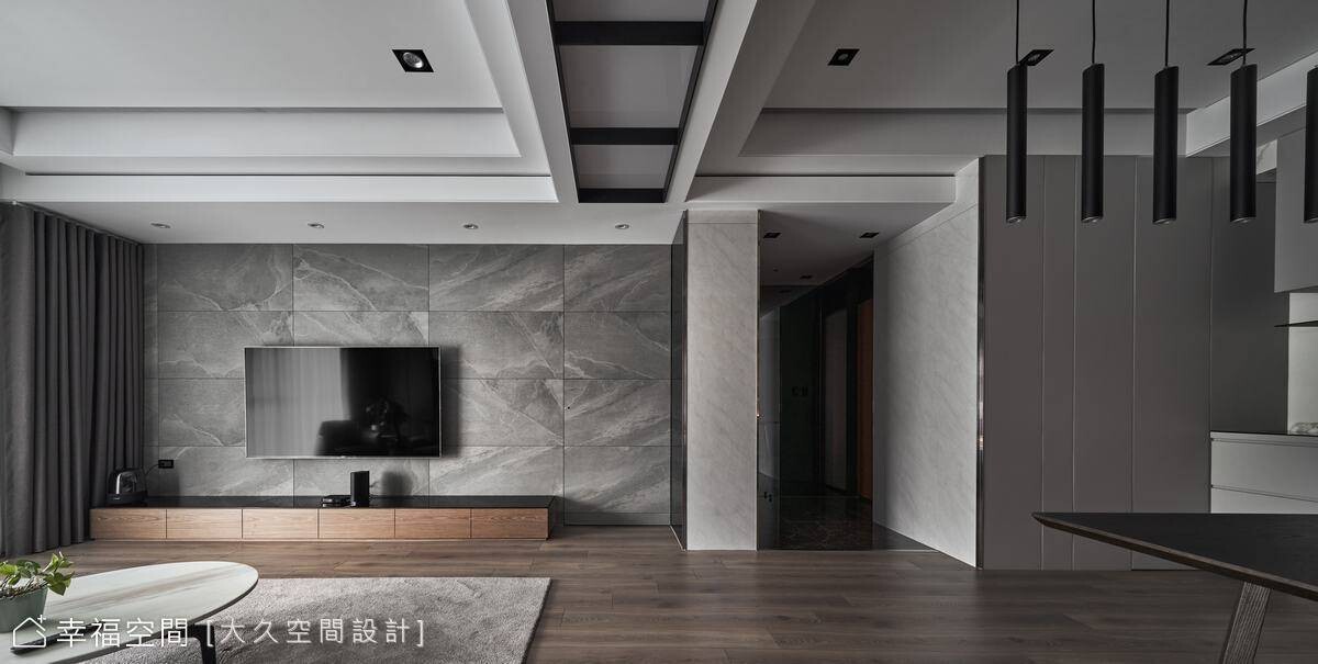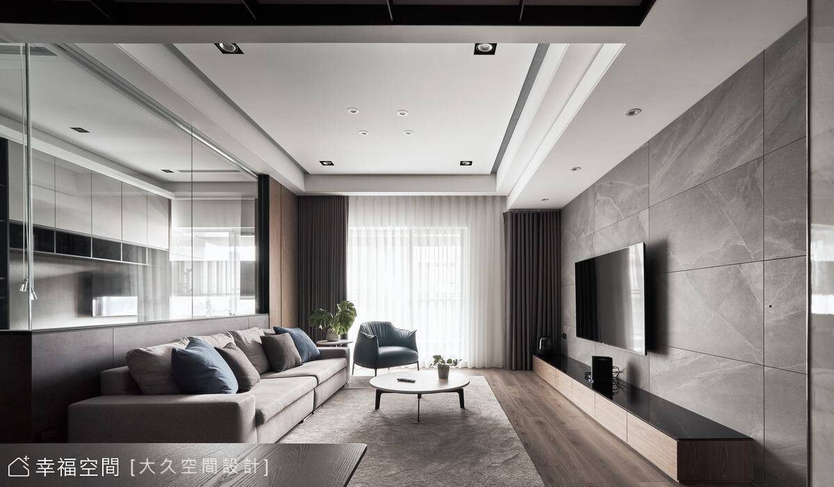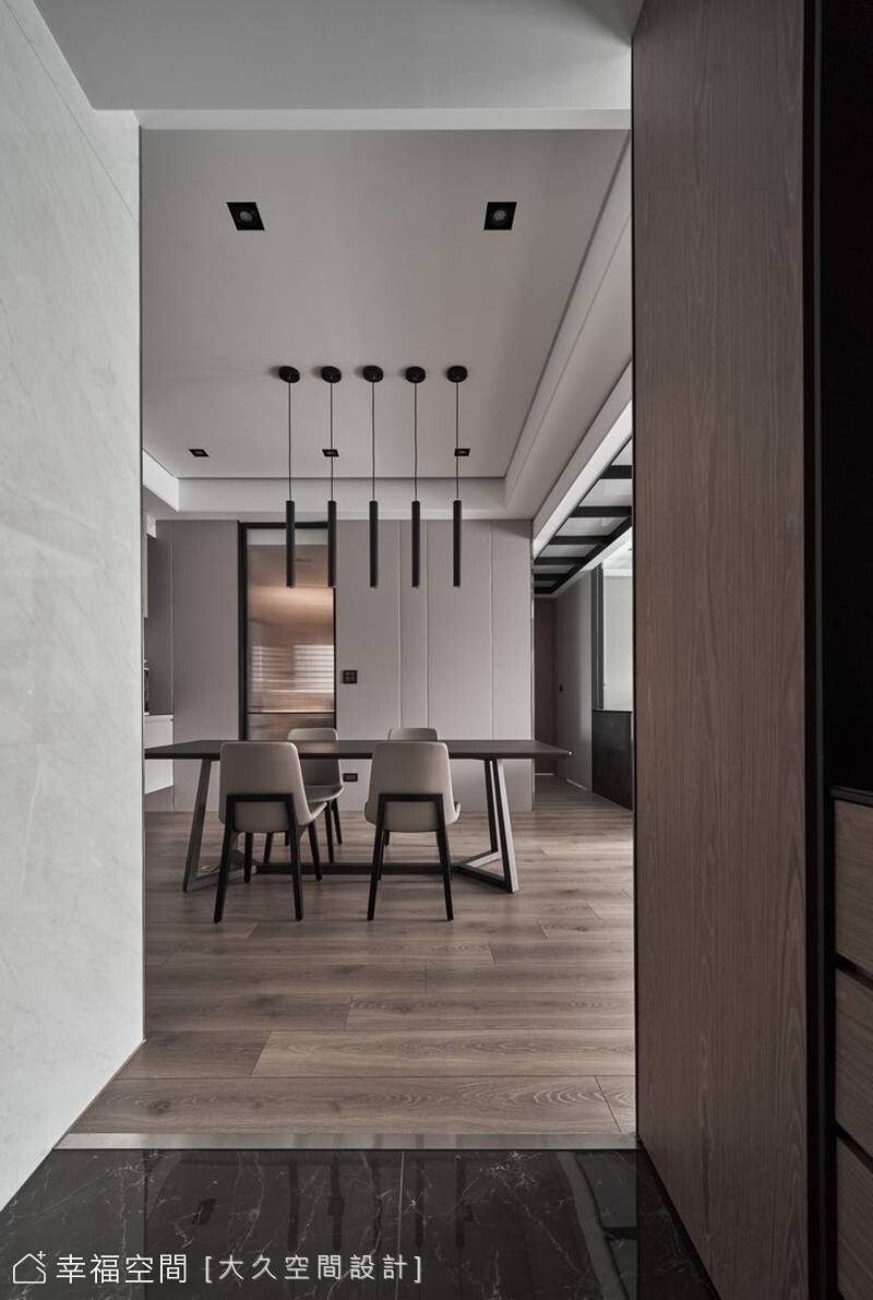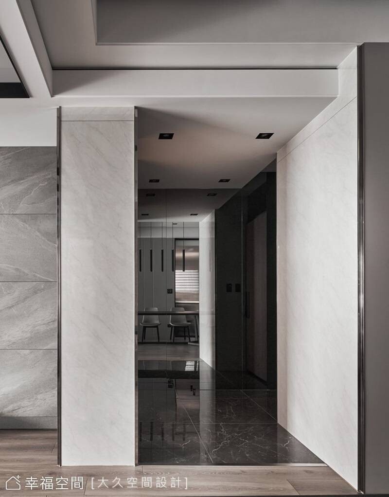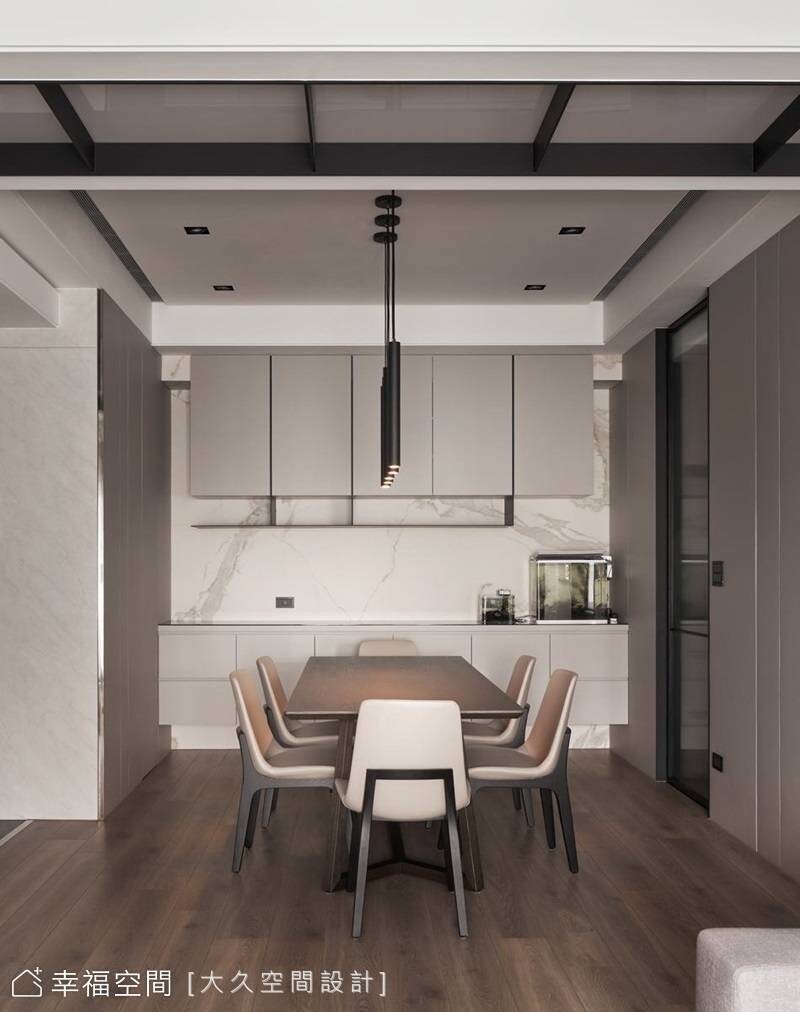 全室任一牆面轉角皆以金屬收邊,展現細膩質感,搭佐屋主偏好的木料、皮革等材質,營塑家庭溫度。入口處前方配置櫃體牆收納鞋履,同步劃分出玄關區,再於地坪鋪墊深色石紋磚,側牆覆上大鏡面,映射開闊遠景,揭開低歛優雅序幕。電視牆以石紋磚闡述自然人文語境,當中的次臥房門片以精湛工藝鋪貼上同質材,避免畫面被切割得零碎,塑造一氣呵成整體感。餐廳皮革立面與木地坪薈萃溫潤暖意,勾勒溫馨餐敘光景,一旁備餐櫃結合吊櫃、懸空式下櫃與輕巧鐵件層架,編織虛實交錯畫面,形成不容忽視的室內美景。