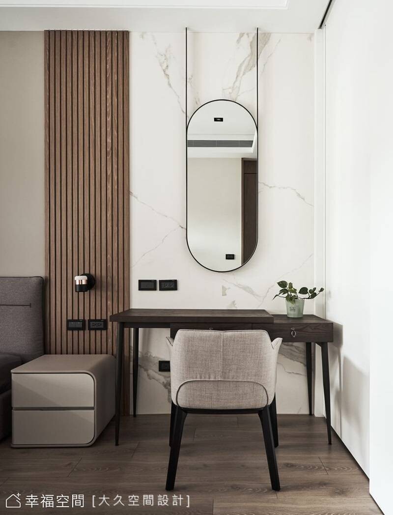 步入私領域,主臥室床頭經設計師解構公領域元素,重新組構而成,呈現均衡的對稱布局,傳遞舒和悠閒的舒眠氛圍。另一端的女兒房,揉合銀狐石材、格柵並搭配圓弧鏡面與饒富設計感的化妝桌圍塑女性化格調,賦予現代時尚情境。簡約卻耐人尋味的不凡擘劃,令居者如同長住於心儀飯店,浸潤於人文丰韻中,過得舒適愜意。