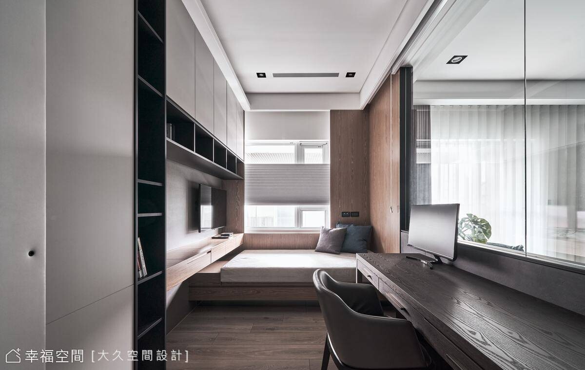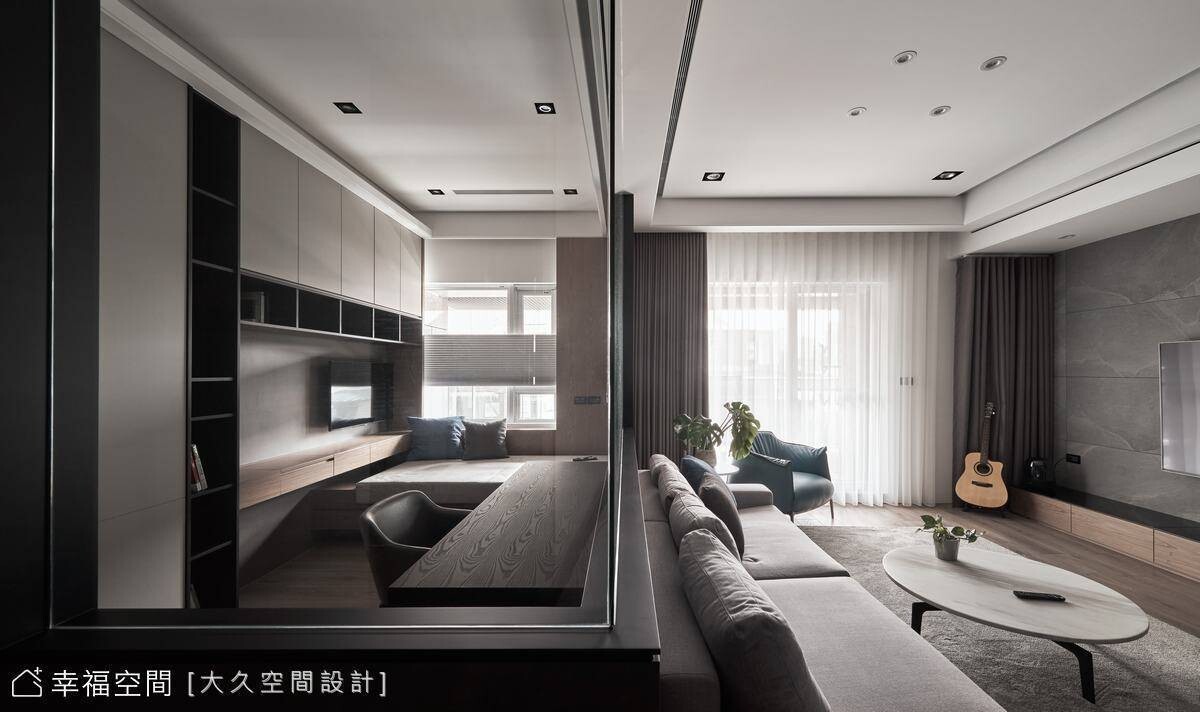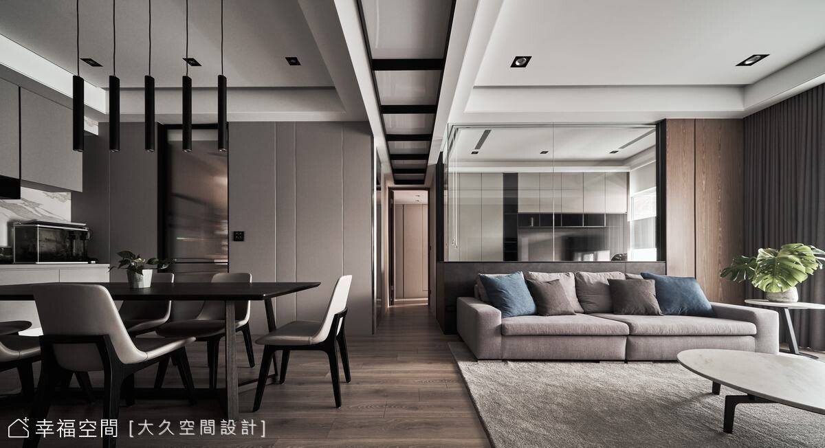 書房運用透光玻璃材質掃除陰暗,迎來光亮清透感,但當長輩來訪,仍可放下隱藏的風琴簾,變身隱蔽性十足的私密客房,至於內部則在植入充足機能的狀況下,適度融合開放式陳列架與鏤空設計,平衡視覺重量,亦增添陳列功能。而自客廳貫穿至廊道盡頭,結合鐵件的流明天花,不僅是屋主喜愛的元素,更兼具拉伸視野、分野場域、引導動線、聚焦視覺的多重作用,娓娓訴說設計師美學與機能並重的空間思維。