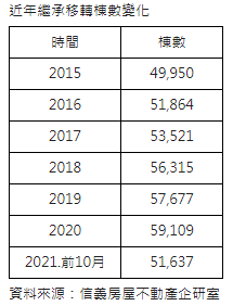 今年前10月繼承移轉登記達5.16萬棟,已經連續六年繼承移轉棟數都超過5萬棟,今年預計將超過6萬棟,主要都會區繼承最多的是新北市1萬棟、台北市8376棟、高雄市6098棟、台中市5412棟、桃園4千餘棟、台南3千餘棟。
