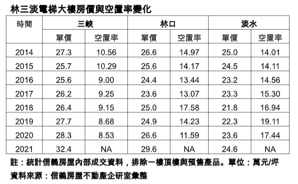 林口三峽電梯大樓房價雙雙在今年創下新高,兩者逐漸擺脫鬼城標籤,信義房屋不動產企研室指出,觀察林三淡長期的空置率與房價表現,發現空置率10%是重要的關鍵密碼,三峽空置率跌破10%後就呈現緩漲向上,林口則是去年空置率大降至接近10%,房市從供過於求到供需逐漸平衡,兩者的電梯大樓房價雙雙在今年寫下房價新高。