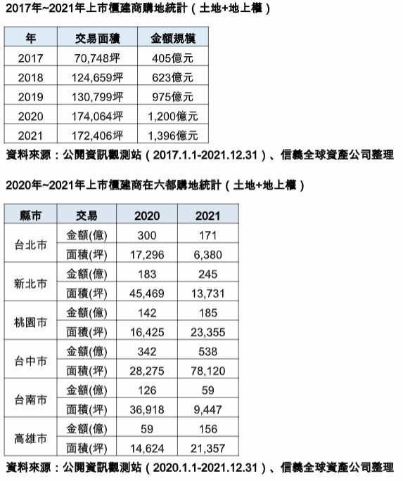 建商買土地金額已創下歷年新高,台中、桃園、高雄最搶手。根據信義全球資產公司彙整2021年上市櫃建商購地記錄,土地總交易金額達1,396億元,全年土地交易面積達17萬坪,有近9成交易落在大台北之外,其中,台中交易7.8萬坪、桃園2.3萬坪、高雄2.1萬坪,顯見建商對中南部市場看法樂觀。