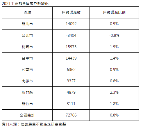信義房屋統計去年家戶數量變化,全年家戶增加7.27萬戶,增量創下1968年以來的新低量,過去家戶增加與房地產景氣呈現正相關,通常房市熱絡與新成屋落成量大時,都會帶動家戶數增加,不過2021新成屋完工數量高,且房市移轉創下8年新高,但家戶數增加數量卻不同調,增數反而創下近半世紀的新低紀錄,若以區域表現來看,新竹縣市與桃園市是戶數增加最顯著的區域。