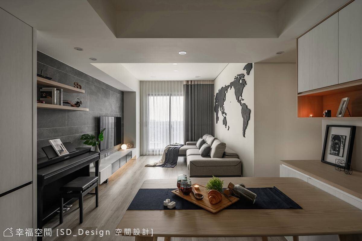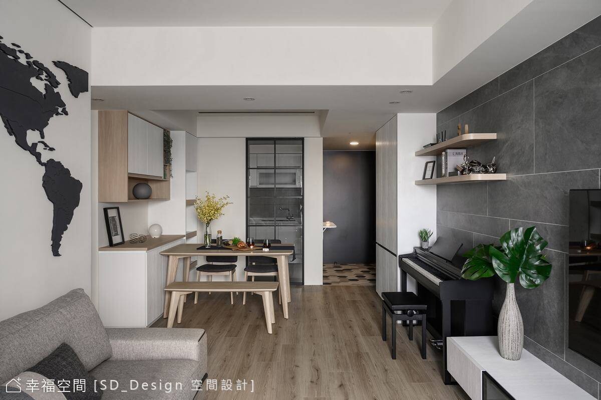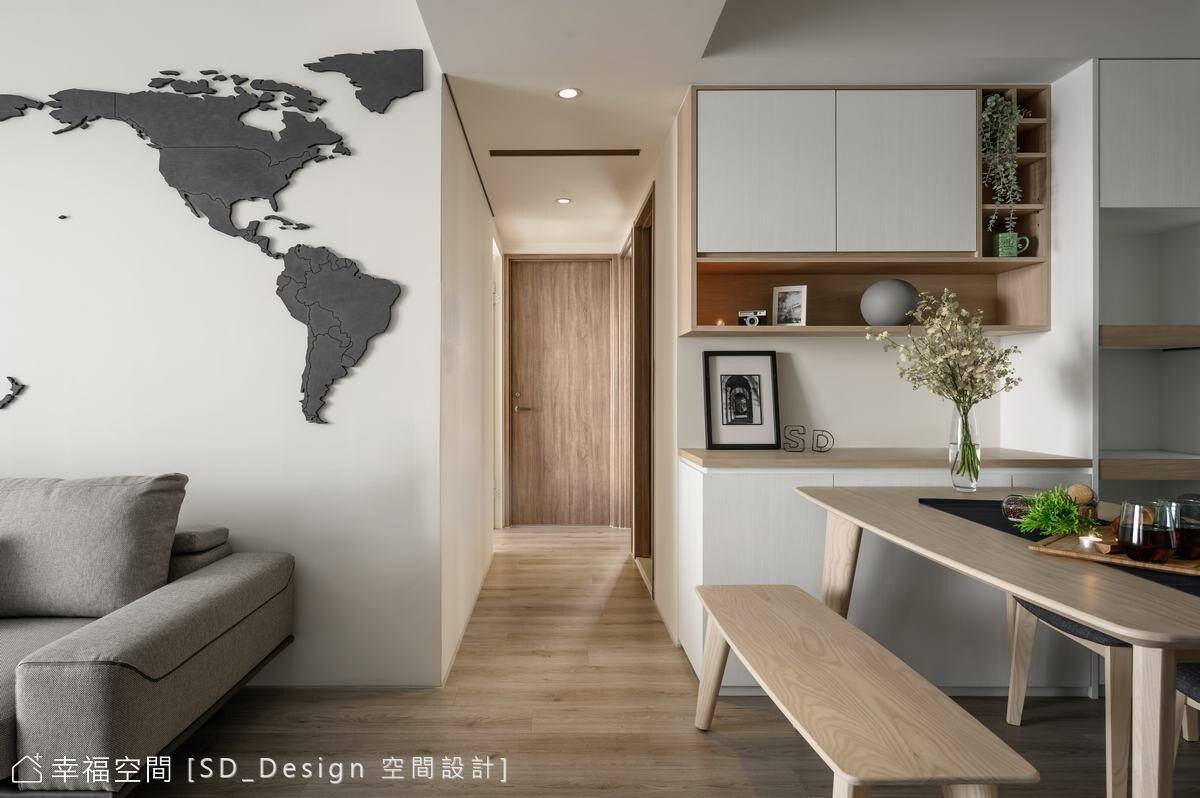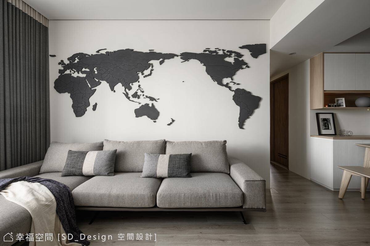 從事科技業的年輕屋主夫妻,期望35坪的新家能以現代北歐風作為空間底蘊,設計團隊針對屋主的需求,規劃了基礎收納外,也為屋主打造期望中擁有的文創藝術牆面(磁性世界地圖)作為客廳的背牆,並在建材選用上,也都符合屋主要想要使用GD綠裝修的建材標準。
