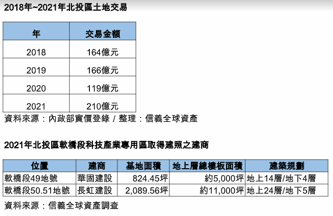 信義全球資產總經理柯宏安分析,近年在產業回流需求下,地方政府積極投入科技產業園區的發展,確實帶動區域土地交易,繼內科及南港土地交易熱絡後,北投區也成為近年發展亮點,除了建商積極購地外,也有Volvo、汎德永業等汽車大廠設立旗艦展售中心,此外產業部分也有華碩、中鼎、仁寶及康舒科技等大型企業在此區設置總部大樓。