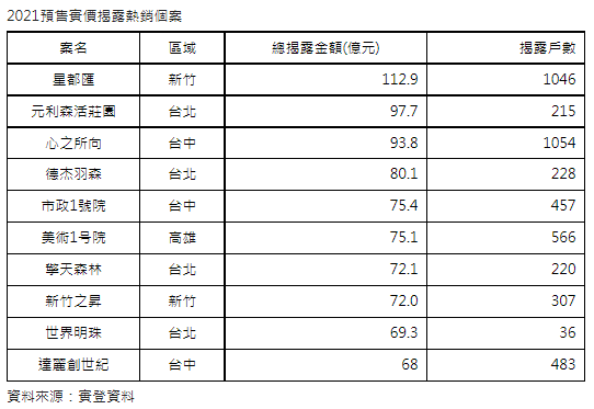 去年前10大熱銷個案,第一名是新竹的「星都匯」,總揭露金額達112.9億元,成為市場最熱銷的推案,不過可能受到未來預售禁止換約影響,目前已經有近百戶在網路上刊登出售訊息,第二名則是台北市的「元利森活莊園」,實價揭露近百億元,第三名則是台中的「心之所向」,揭露金額也達94億元。