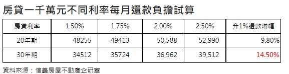 以房貸千萬元試算,20年期利率1.5%試算,本利平均攤還每月還款金額為4萬8255元,若長期升息到2.5%,每月還款金額就增加到5萬2990元,升息1%還款金額多出9.8%。