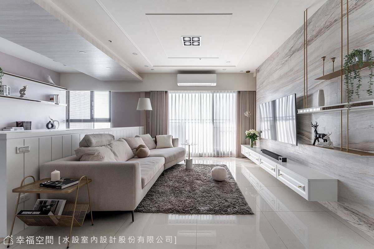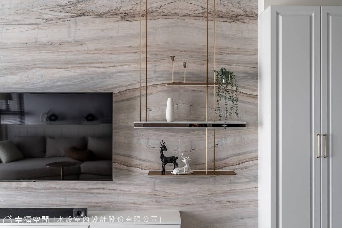 客廳紋理優美的大理石披覆整面電視牆,搭配金屬鐵件提煉奢華感,塑造雅致的室內風情畫。