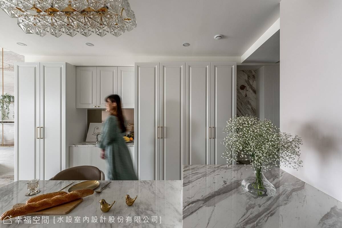 玄關為滿足所有需求,水設室內設計於玄關植入大量櫃體提升藏物量,當中巧妙揉合紋理如水墨畫的大理石,呼應同材質的中島,再配上金屬壁燈的微暈燈光,形塑高雅端景。地坪部分,鋪陳跳色花磚帶入復古元素,亦營塑出返家的儀式感。