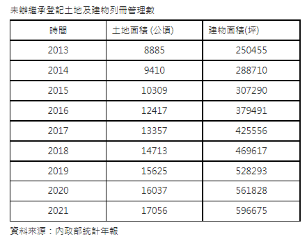 內政部統計年報顯示,2021年未繼承的土地有1.7萬公頃,較2013年增加近一倍,且未繼承的建物面積更達59.7萬坪,也較2013年增加超過一倍,反映人口老化的趨勢正在加劇,且去年繼承移轉登記6.3萬棟也創下歷史新高。