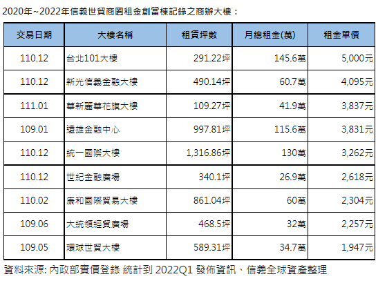 根據實價登錄租金揭露,華新麗華花旗大樓在今年1月出現一筆總租金約42萬,換算每坪單價3,837元,創下當棟新高;台北101更從2013年每坪不到3,000元,2020年至今已有10筆實價租金超越每坪4,000元。未來此商圈還陸續會有富邦A25、遠雄大巨蛋、信義行政中心地上權案及世貿三館地上權案完工,都可能有機會再出現創記錄的指標案。