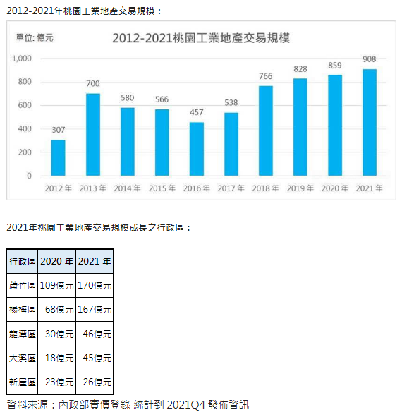 信義全球資產統計桃園各行政區的工業地產實價登錄交易規模,2021年共有5個行政區交易規模較2020年成長,分別為楊梅區(總金額167億,較前年增加99億)、蘆竹區(總金額170億,較前年增加61億)、大溪區(總金額45億,較前年增加27億)、龍潭區(總金額46億,較前年增加16億)、新屋區(總金額26億,較前年增加3億)。這些成長區域位置,除了蘆竹區外,多位於南桃園,顯示企業布局南擴的態勢明顯。