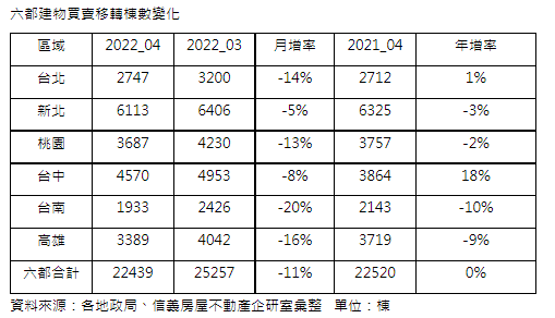根據六都地政局公布的移轉棟數資料顯示,今年4月六都移轉棟數為2.24萬棟,大致較去年同期持平,但月減幅度為11%,主要影響原因除了政府持續打炒房與升息外,4月工作天數比3月少了17%也是影響很重要因素之一。