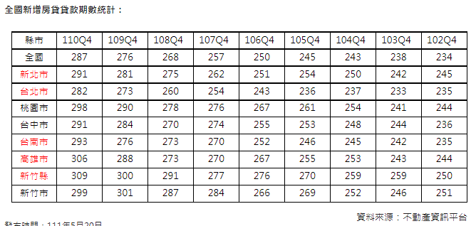 根據不動產資訊平台最新資料顯示,去年第四季全國的房貸期數居高不下,和第三季一樣維持在287期,接近24年的水準,其中,主要都會區的房貸期數仍不斷攀升,包括六都中的新北市、台北市、桃園市、高雄市與非六都的新竹縣,房貸期數都創下歷史新高,反映這些區域使用30年期房貸的房貸族仍持續增加。