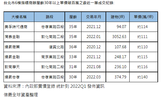 信義全球資產觀察實價登錄辦公室買賣記錄,發現台北市指標商辦中屋齡30年以上的大樓,就有6棟大樓近年交易單價站上百萬,包含「美孚時代通商」、「揚昇忠孝大樓」、「揚昇金融大樓」、「揚昇商業大樓」、「潤泰金融大樓」、「敦南摩天大樓」。這些單價達百萬等級的老商辦,雖然屋齡高,但因位處核心區位條件,原本就是區域指標大樓,加上商圈空置低且企業需求高下,價格反而有所支撐。