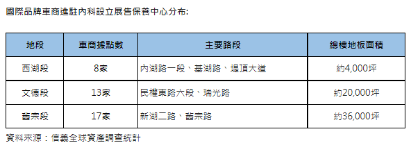 內科不只吸引企業總部、科技業進駐,現在也成為國際品牌車商搶進插旗熱區。根據信義全球資產統計,各家國際品牌車商總共在內科設立了38個汽車銷售展示及保養維修中心據點,看準服務高端消費客群,不少據點更是採全新興建成大型旗艦中心,總計打造出的展銷與保養維修中心的空間面積達6萬坪,其中以舊宗段為車商進駐布局最激烈的地方。