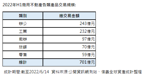 信義全球資產統計2022年上半年上市櫃法人商用不動產交易,總交易金額為701億元,雖較去年同期減少47億元,但仍為有統計記錄以來的第二高,交易熱區以台北及台中為主,兩區域都有破百億規模。以產品類別看,辦公與工業地產成雙引擎支撐H1交易,其中辦公室交易規模超越工業地產,也較去年同期成長逾一倍,保險公司是主要關鍵買方。