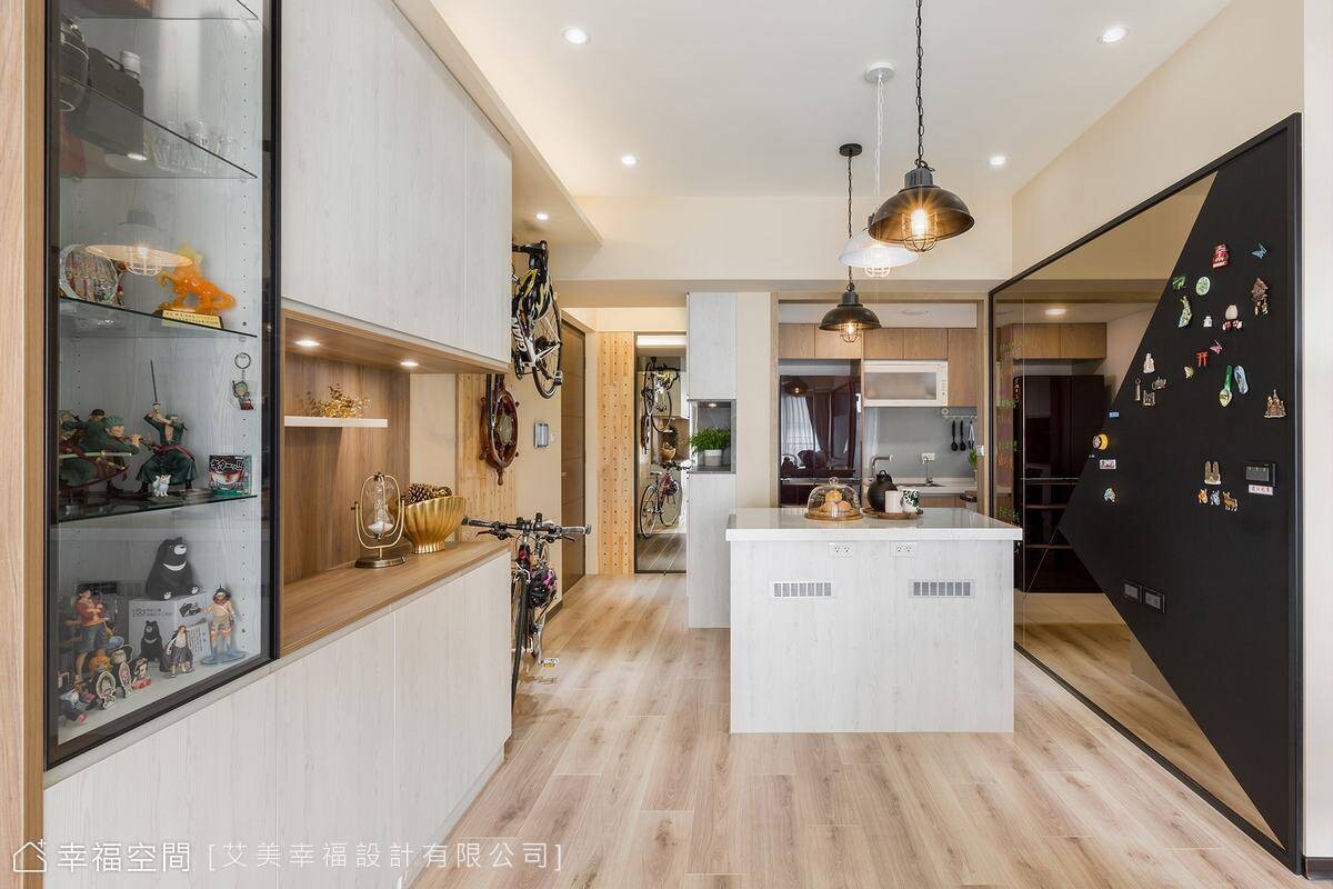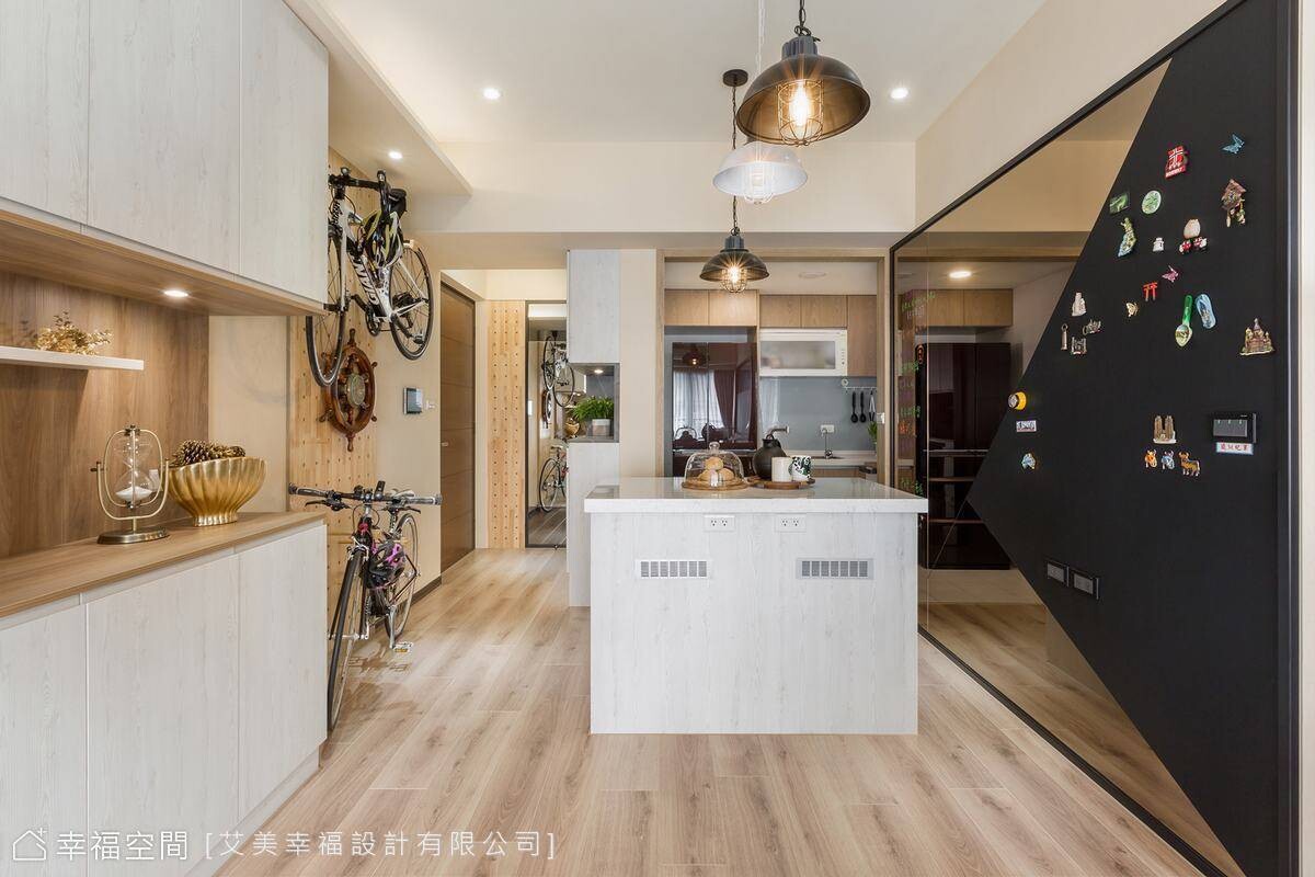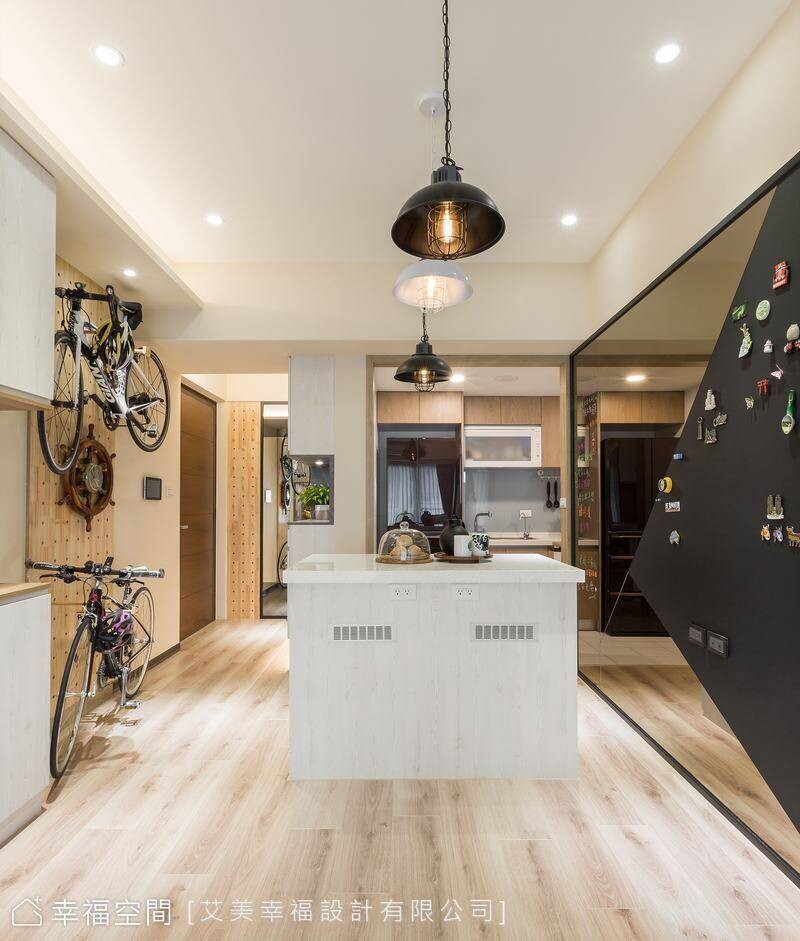 餐廳的部分選用白色大理石台面的中島,下方收納電器,使桌面維持乾淨簡潔,讓喜歡烹飪和烘培的屋主母親能輕鬆自如地下廚及製作麵包糕點。客餐廳以中島吧台作區隔,使空間更寬敞舒適,大面積的不規則鏡面和鐵件組合,除了營造空間延伸的效果,能吸附磁鐵的鐵件和書寫文字或畫圖的鏡面,更令整個空間活潑了起來。