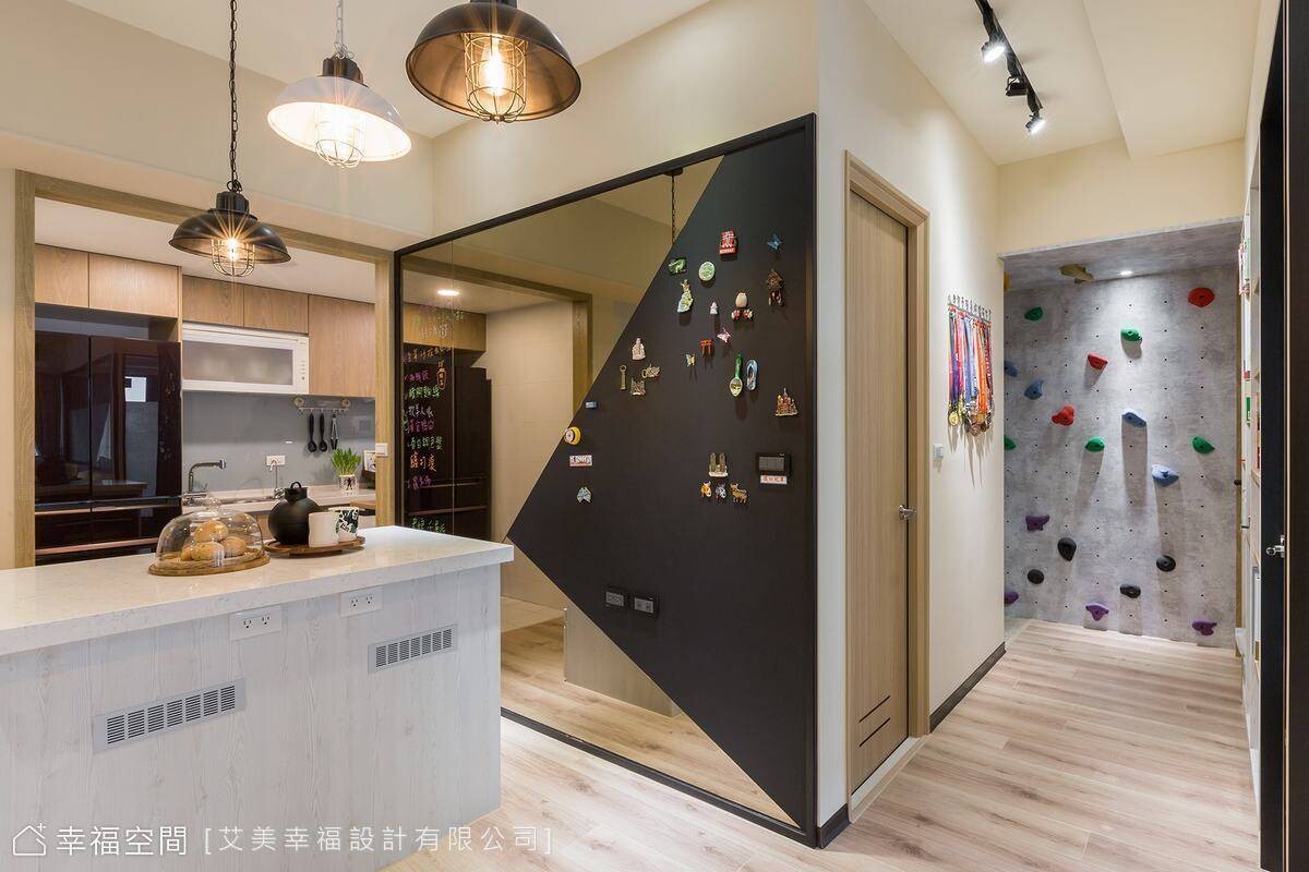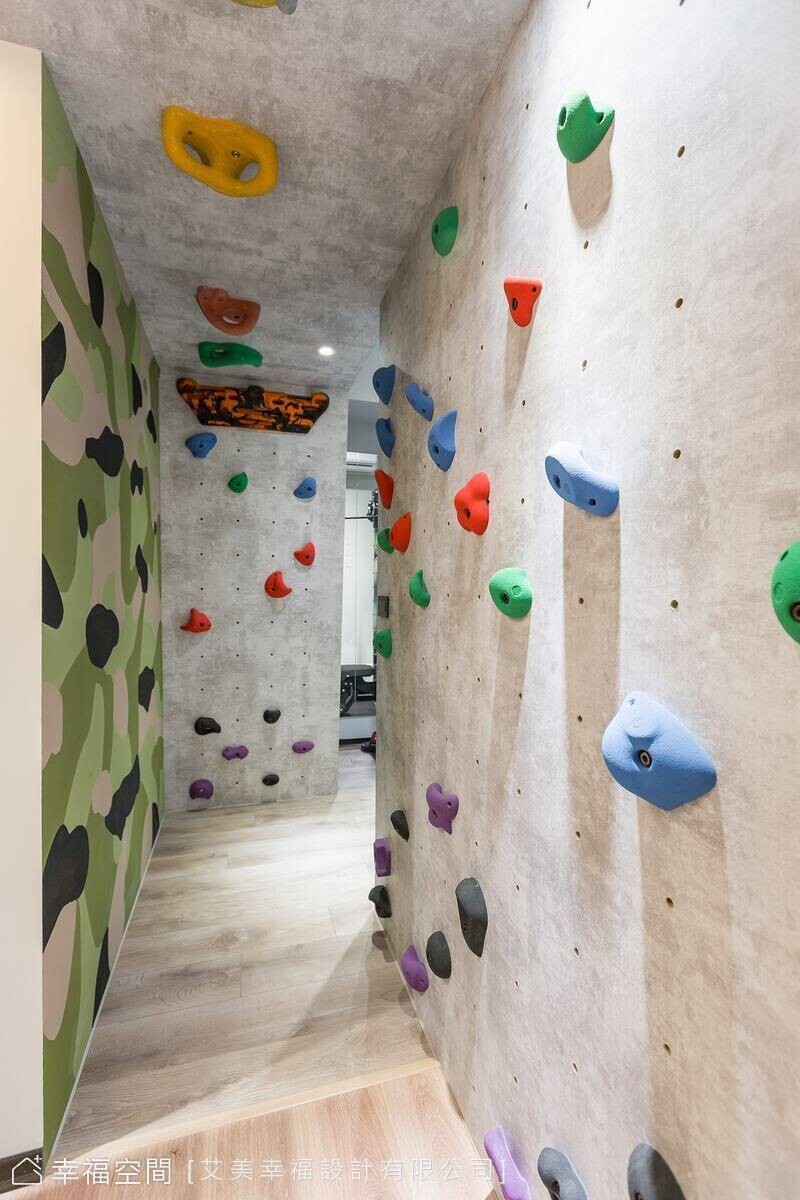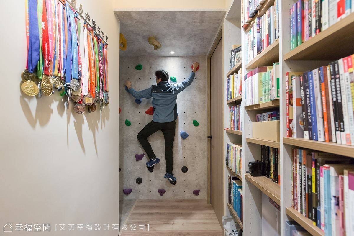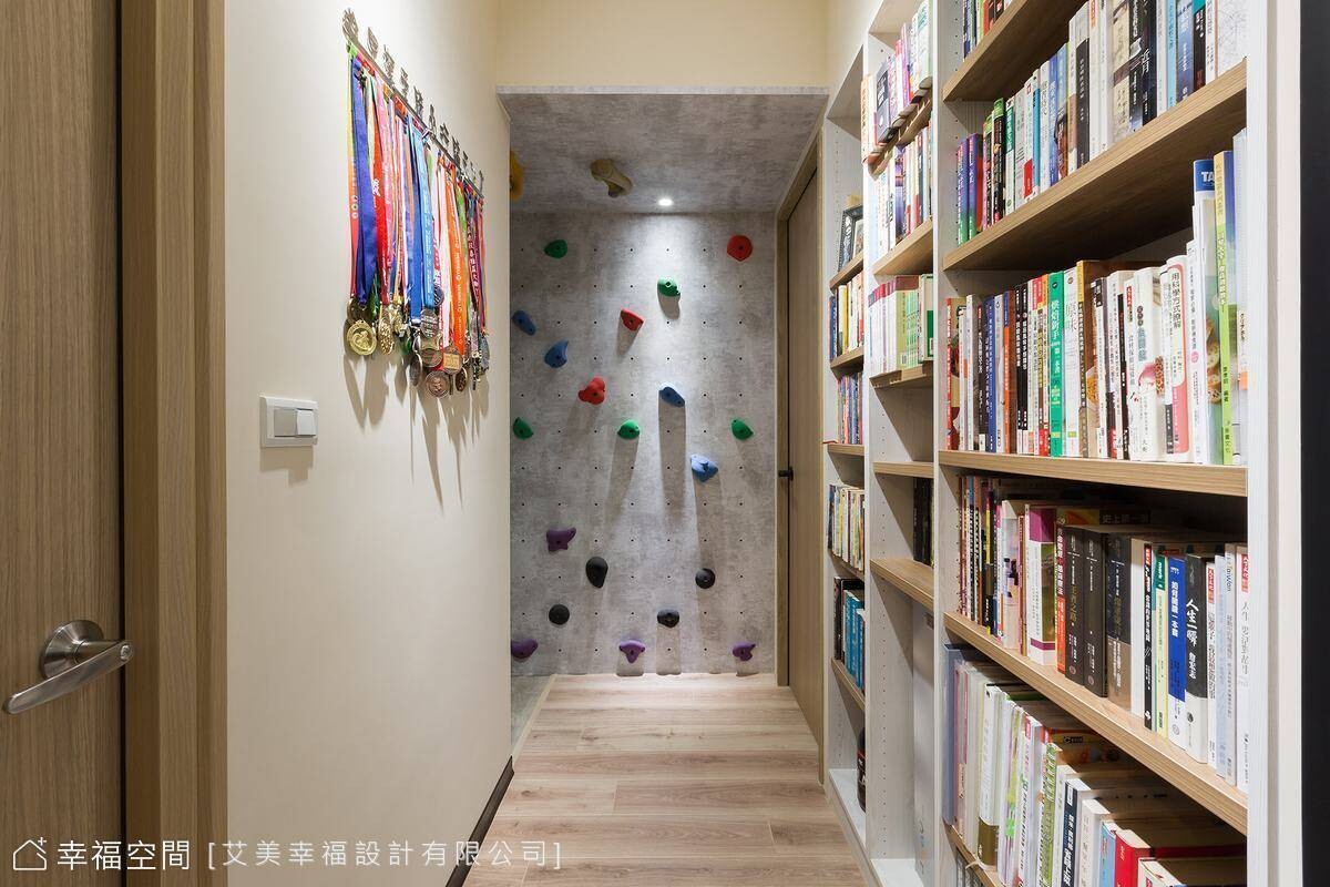 另一方面,考量到屋主和家人都有閱讀習慣,我們靈活運用走道空間,在走道右側牆面規劃一整面的書櫃,雖然正前方映入眼簾的是攀岩牆的起始處,但二者不但沒有違和感,反而讓屋主感受到我們努力打造一處兼顧全家人需求的居所之用心。