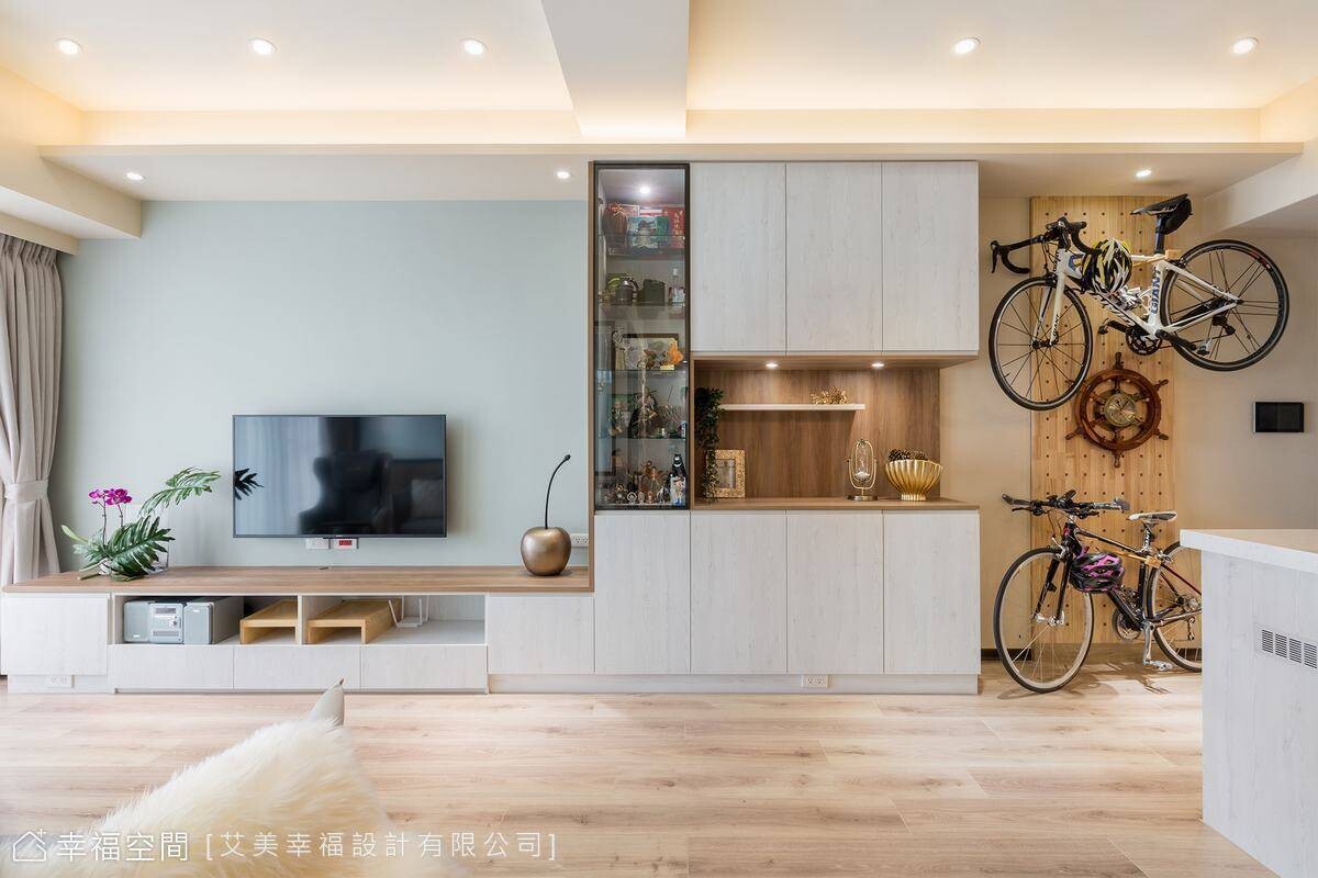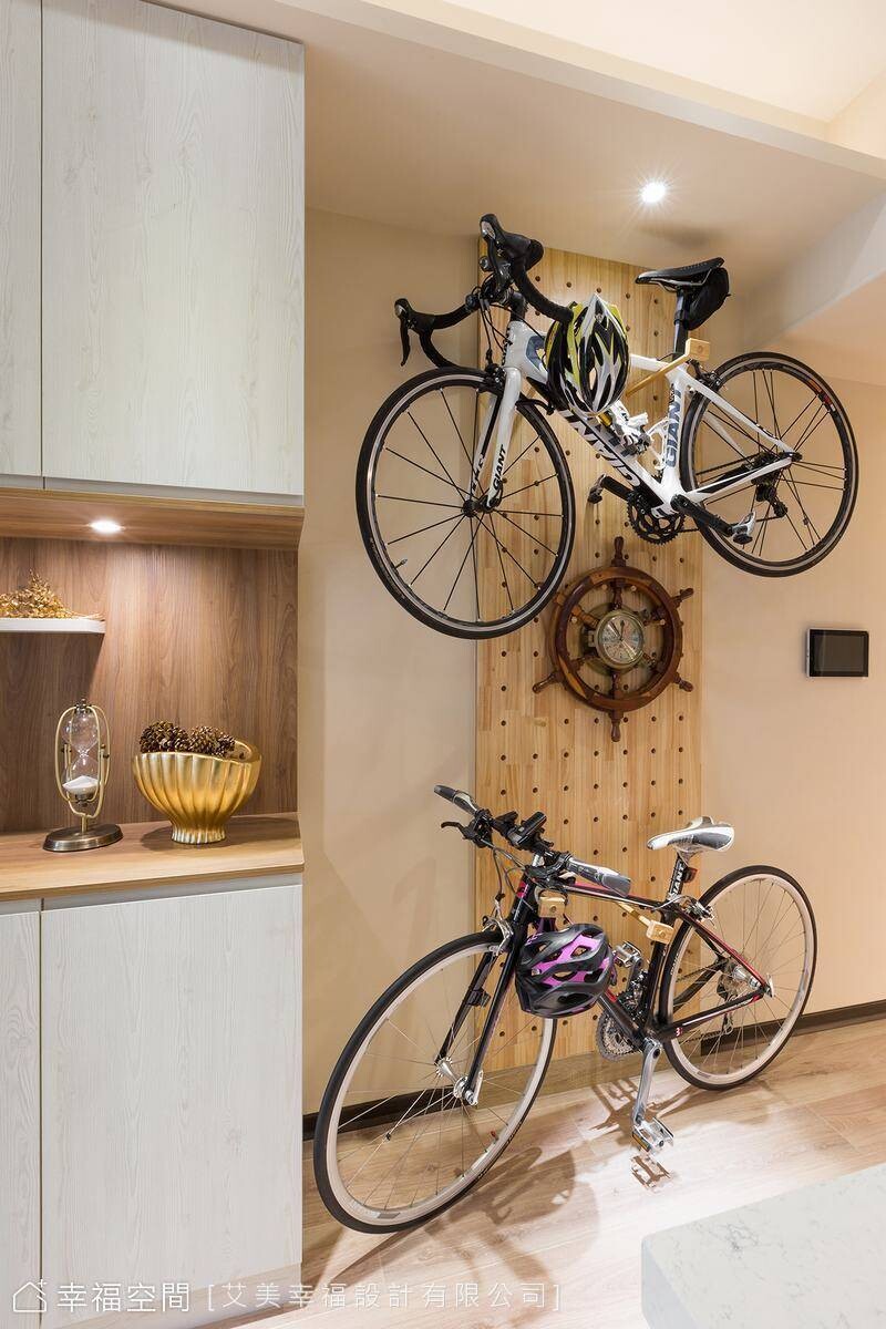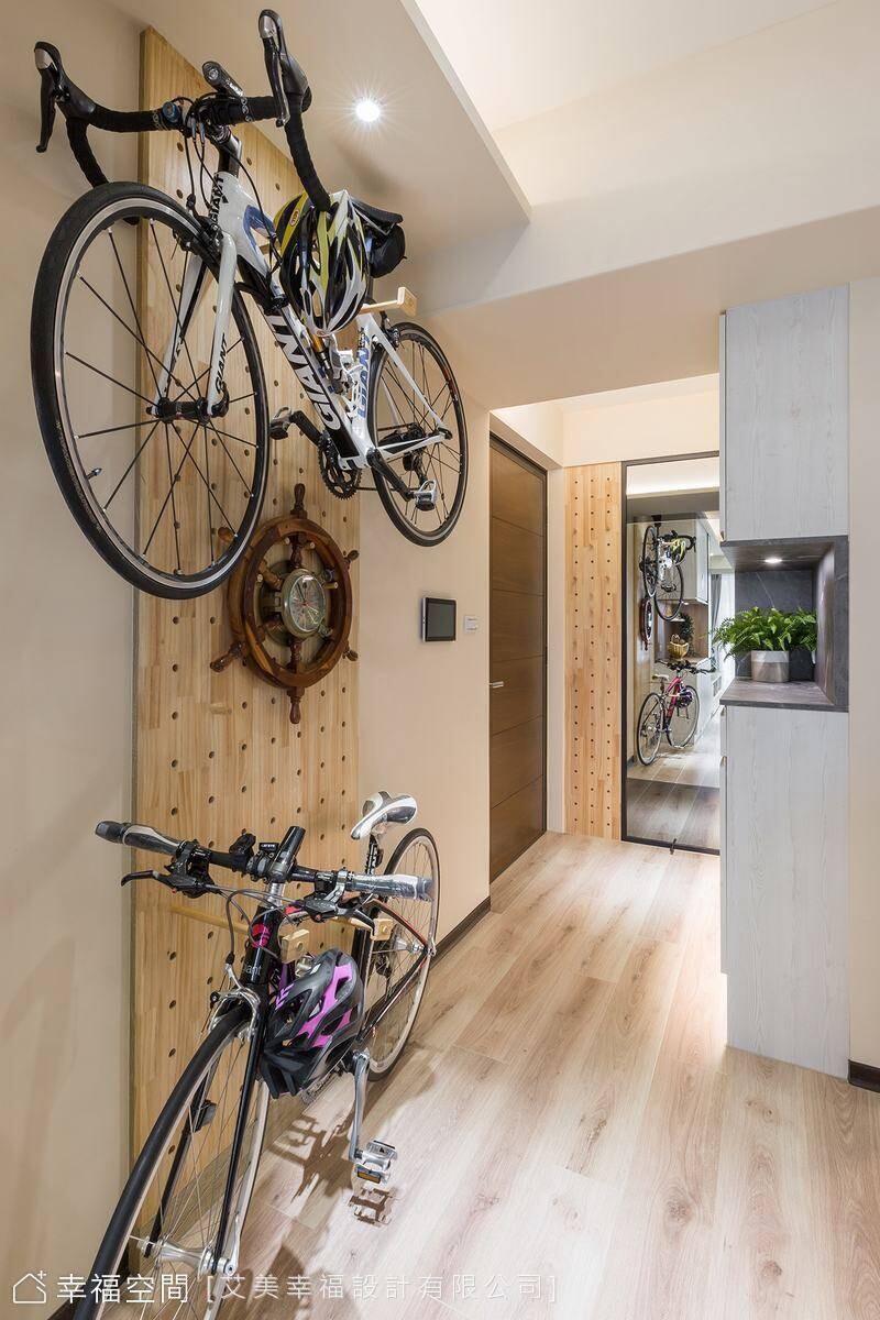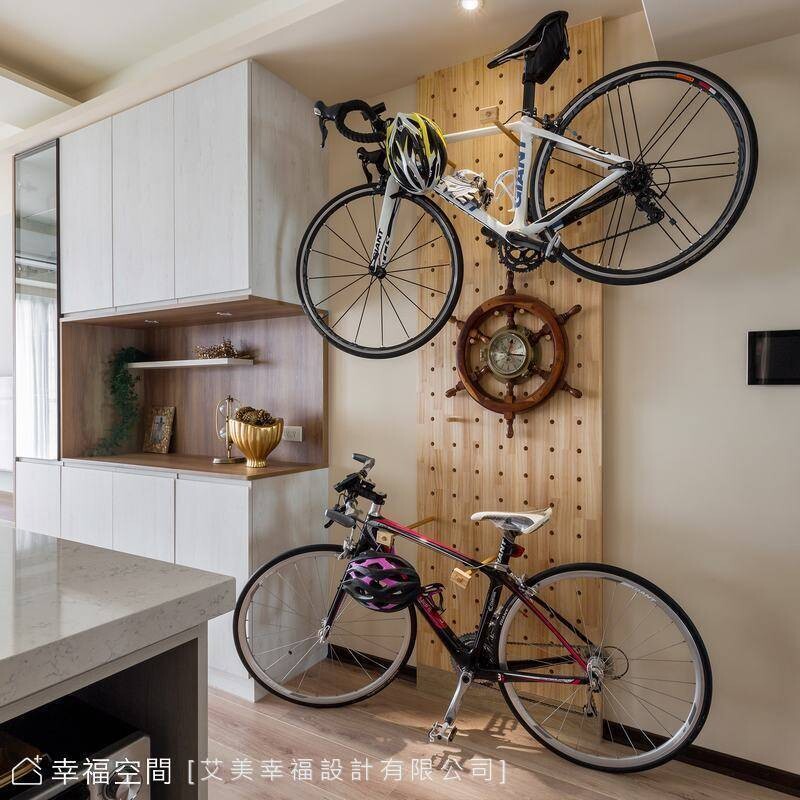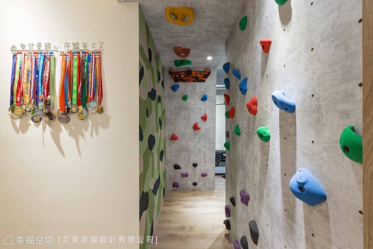 一進入本案客廳,任何人都無法不被懸掛在牆上的兩輛腳踏車吸引,再往起居室走進去,吸睛的攀岩牆又讓人忍不住發出讚嘆聲,而最叫人驚奇的則應該是隱身在屋子最內側的史密斯專業健身房。的確如預期般,屋主是位熱愛運動的女軍人,走道左側牆上掛了為數不少的馬拉松、單車賽等勳章,記錄著屋主對運動賽事的投入與優異成績,也為屋主與訪客創造更多話題。