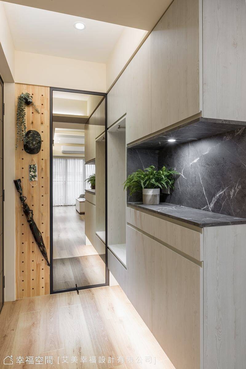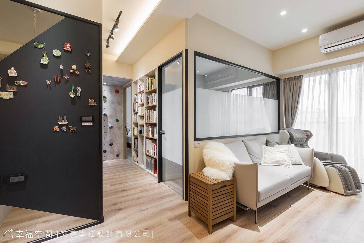 主要建材:黑鋁框滑門、系統家具、木作造型、強化玻璃、茶玻、洞洞板、鐵件、攀岩牆