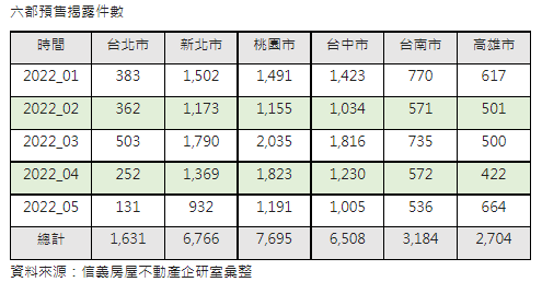 統計顯示,去年的9~12月每月的預售揭露件數都達1.2萬件以上,今年前五月則件數都不到一萬件,五月甚至還尚未超過六千件,六都前五月件數最多的是桃園市的7695件,反映當地市場交易相對穩定,其次則是新北市的6766件,台中市則有6508件,台南市3184件,最少的是台北市的1631件。
