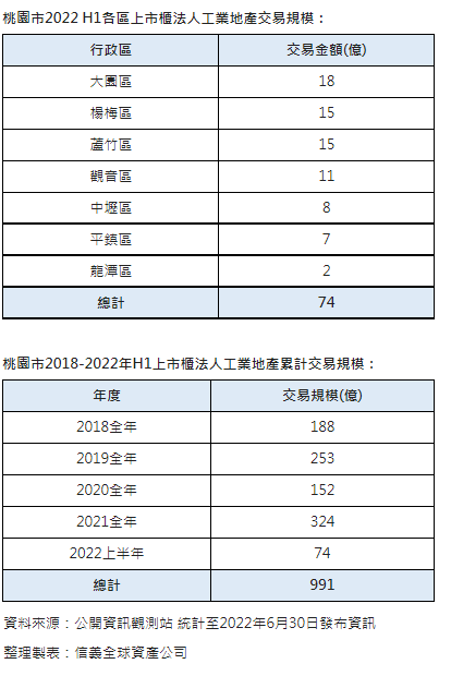 信義全球資產經理林建勛表示,近年中美貿易戰以及疫情改變了全球供應鏈布局,帶動台商回台,而桃園市向來為全台工業大城,自然是產業重點進駐區域,累計自2018年起至2022年上半年,上市櫃法人在桃園市的工業地產大型交易已達991億元,直逼千億大關。今年上半年桃園市工業地產交易規模為74億元,不僅已佔桃園整體商用不動產總規模91億元的81%,此外,也是自2018年起,已連續五年H1工業地產交易金額都破70億元。