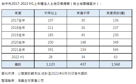 信義全球資產觀察台中市土地交易趨勢,統計2017年至2022年上半年上市櫃法人大型交易,台中市土地累計交易規模達1,560億元,若以土地面積區分,其中千坪以上的土地交易總額為1,123億元,佔整體規模72%,未滿千坪的土地交易總額為437億元,佔比雖較低,但2020-2021年已連兩年都單年破百億,除了顯示建商看好台中廣大市場商機積極布局外,也嗅出在激烈競爭下,建商不斷在調整其購地策略。