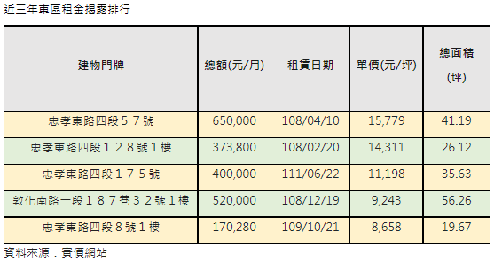 沉寂已久的東區店面,此次實價揭露出現一筆單價破萬元的租賃紀錄,今年6月有業者以每坪1.12萬元,承租忠孝東路四段店面。