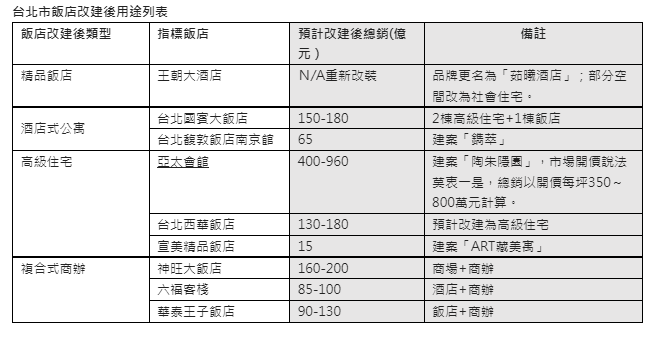 若飯店業者選擇重建,安信建經歸納四種改建後主要類型作為參考,包含:「精品飯店」、「酒店式公寓」、「高級住宅」、「複合式商辦」,等四大類,當中又以「酒店式公寓」、「高級住宅」和「複合式商辦」居多。