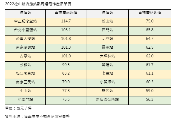 統計今年捷運松山新店線沿線的捷運站點,電梯產品平均房價最高的是中正紀念堂站每坪114.7萬元,台北小巨蛋站每坪103萬元,台電大樓站平均每坪102萬萬元,南京復興與古亭站則都是每坪101萬元,捷運公館站則是每坪99.5萬元,目前已經有五個捷運站電梯產品單價站上百萬元,但在捷運松山線2014年剛通車之際,台北市多數的捷運站單價還在8字頭。