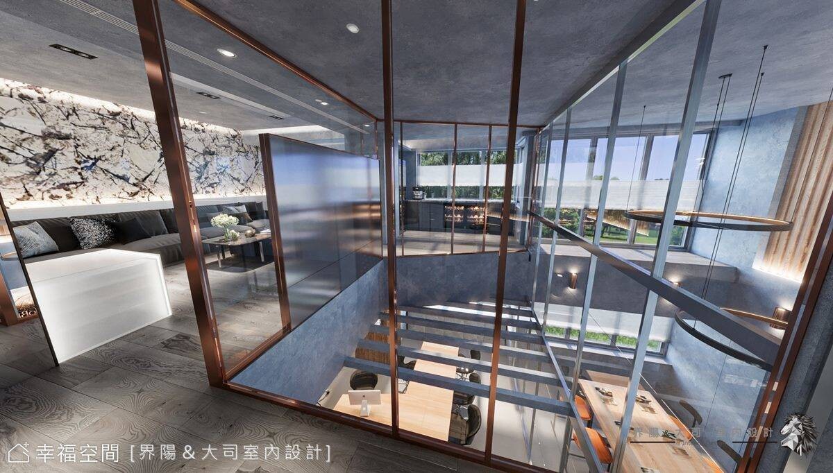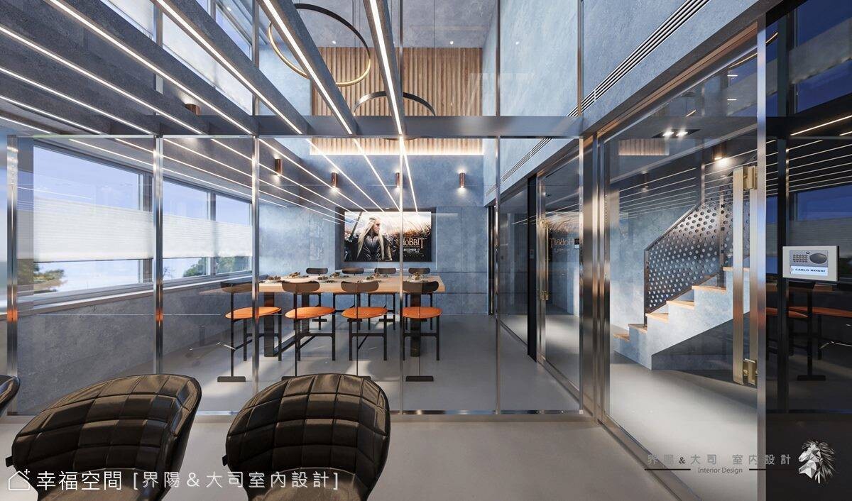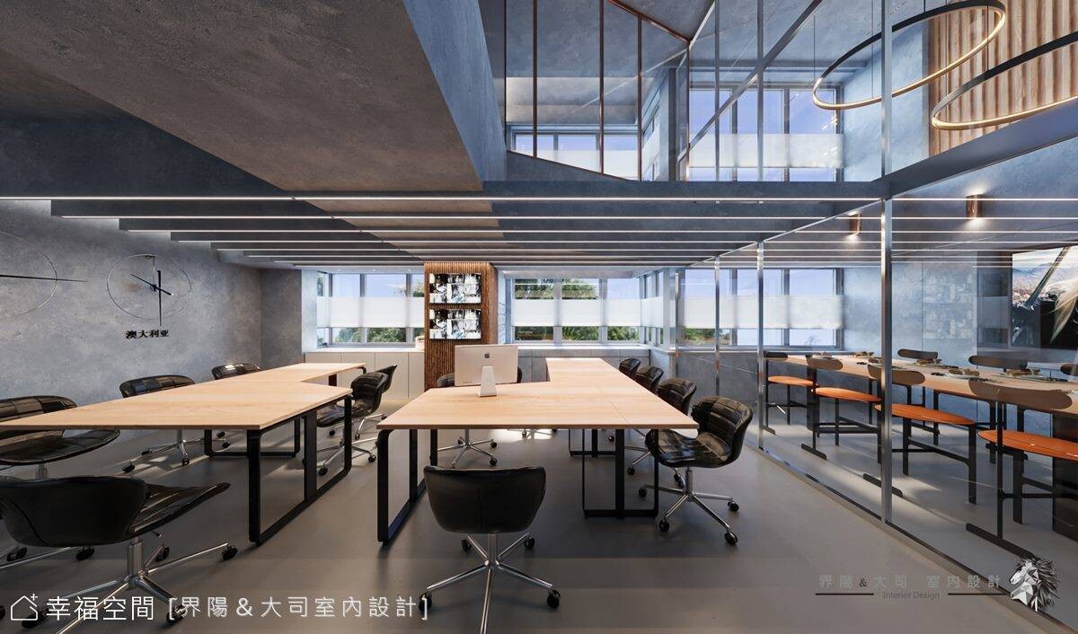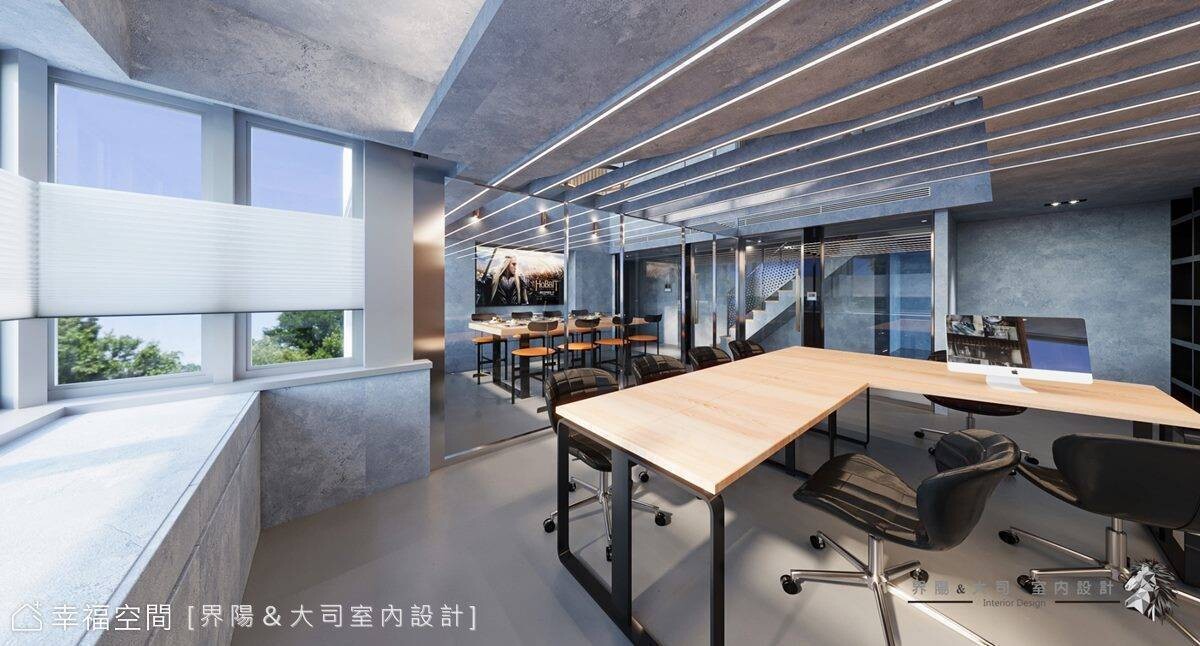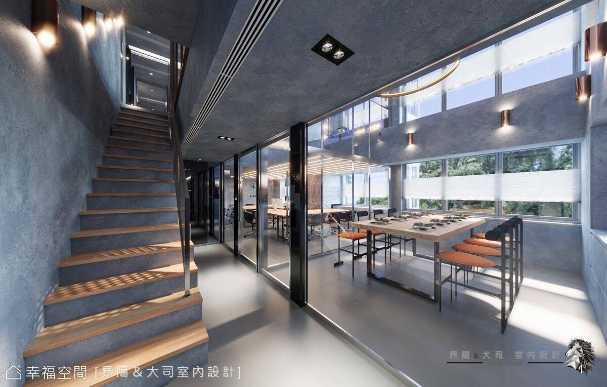 婆娑光影兀自在素雅清水模畫布創作,織就靜謐卻充滿生命力的空間,滋潤疲憊心靈。界陽&大司室內設計此次放大空間優勢,於雙層挑高辦公室刷上沉穩灰調,引入浮光掠影,揉合日本「素」、「破」、「間」的美學意識,為忙碌上班族砌築清寧隱逸的工作環境。