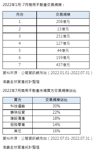 信義全球資產統計2022年7月商用不動交易情形,七月商用不動產交易量達到437億元,較上月交易金額159億、成長174%,也較去年同期交易金額169億、成長158%。單筆交易金額逾50億的交易件數達4件,除桃園航空城土地交易外,內科也有整棟交易,為中國人壽以83.5億買下精英電腦總部大樓。