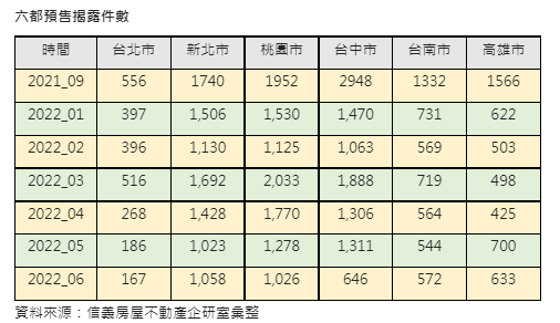 信義房屋統計官方預售實價揭露件數資料,去年第四季景氣高峰時,每月預售揭露的件數可達1.2萬件,單月成交金額達1700餘億元,不過今年上半年市場明顯出現降溫,6月的揭露件數只剩下五千餘件,與去年第四季景氣高峰時的單月交易水準,呈現腰斬的量縮市況,反應出近月市場買氣受到疫情、政策影響,出現大幅降溫跡象。